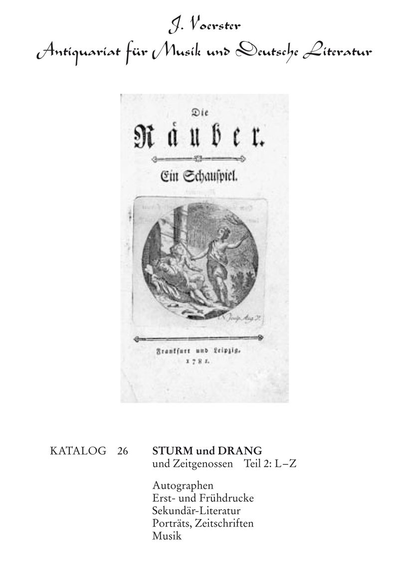 Rezension:Unter der Überschrift „Vergoldung des Glücks“ schreibt Friedrich Pfäfflin in seiner Katalogbesprechung: „Mit Jürgen Voersters Verkaufskatalog 26, ‚Sturm und Drang und Zeitgenossen, Teil 2: L – Z’, der zum Ende des Schillerjahres 2005 erschienen ist, kommt ein Angebot von Schiller und Benachbartem auf den Markt, das in der vom Aussterben bedrohten Gattung der Antiquariatskataloge ganz ungewöhnlich ist. Es ist keine Sammlerbibliothek, die Voerster anbietet. Es ist eine über Jahre gesammelte Bibliothek, die auf knapp 12 Druckbogen mehr als 130 Schiller-Nummern ausweist, darunter die außerordentlichen Rarissima. (…). Ein Entrefilet aber zeichnet diesen Katalog vor allem aus. Es macht ihn zum Dokument der Wirkungsgeschichte: In einem Exkurs führt Jürgen Voerster die Nachdrucke des Mannheimer Theaterplakats oder Theaterzettels von Schillers ‚Räubern’ zusammen. Neun Beispiele werden abgebildet. Voerster hat mit Unterstützung des Schriftensammlers und –kenners Eckhart SchumacherGebler die Besetzungsliste der Erstaufführung vom 13. Januar 1782 untersucht und diese Nachdrucke zu datieren versucht.“ (Aus dem Antiquariat 6/2005).