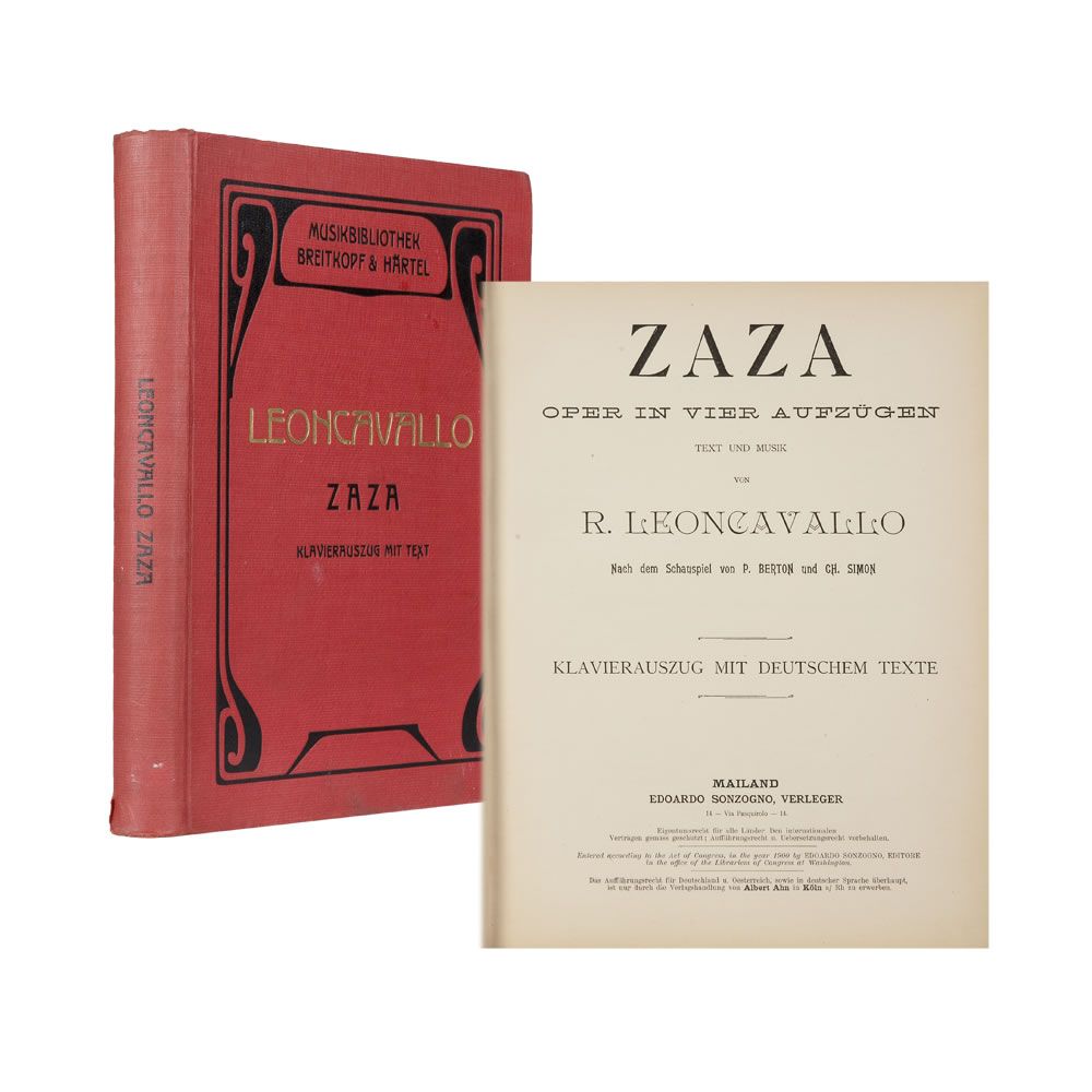 Deutsche Erstausgabe. Selten. - Leoncavallo hatte mit seiner fünften Oper, 1900 erneut von Toscanini uraufgeführt, wenig Erfolg. Dem Sujet von der enttäuschten Varieté-Sängerin Zazà entsprechend, ist das Werk der Operette, dem Varieté und dem Chanson verwandt. Mit der ihm eigenen "Neigung zum Archaisieren" (E. Voss) weist Leoncavallo mit Zazà auf den Neoklassizismus des 20. Jahrhunderts voraus. - BSB 10, 3792; nicht in CPM.
