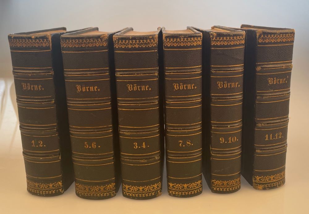 BÖRNE, L.: Gesammelte Schriften. Neue vollständige Ausgabe [herausgegeben von M. Reinganum und J. J. Rütten]. 12 Bände in 6 Hamburg und Frankfurt Hoffmann & Campe und Literarische Anstalt 1862 Mit Stahlstich-Porträt von J. Eissenhardt nach Oppenheim, ohne Vortitel. Exlibris im Vorderdeckel. Halblederbände der Zeit mit Rückenvergoldung, Kanten etwas bestoßen.