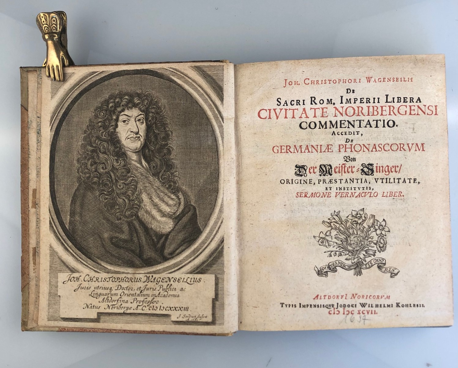 WAGENSEIL, J. Chr.: De Sacri Rom. Imperii Libera Civitate Noribergensi Commentatio. Accedit, de Germaniae Phonascorum. Von der Meister-Singer Origine, Praestatia, Utilitate, et Institutis, Sermone Vernaculo Liber. Altdorf, J. W. Kohlesius 1697 Quart. Gestochenes Porträt, Titel in schwarzrot, 576 S. (recte 580), 1 gefalteter gestochener Plan der Stadt Nürnberg, 12 ganzseitige, teils gefaltete Kupfertafeln, 4 Kupfervignetten, teilweise mit Ansichten von Nürnberg, 6 Bl. Noten sowie 1 Bl. "Des Wilhelm Webers Bildnis" als Gedicht. Einriss auf einem Blatt geklebt, sonst sehr schönes Exemplar. Halbpergamentband der Zeit. Vorderes Gelenk angebrochen.