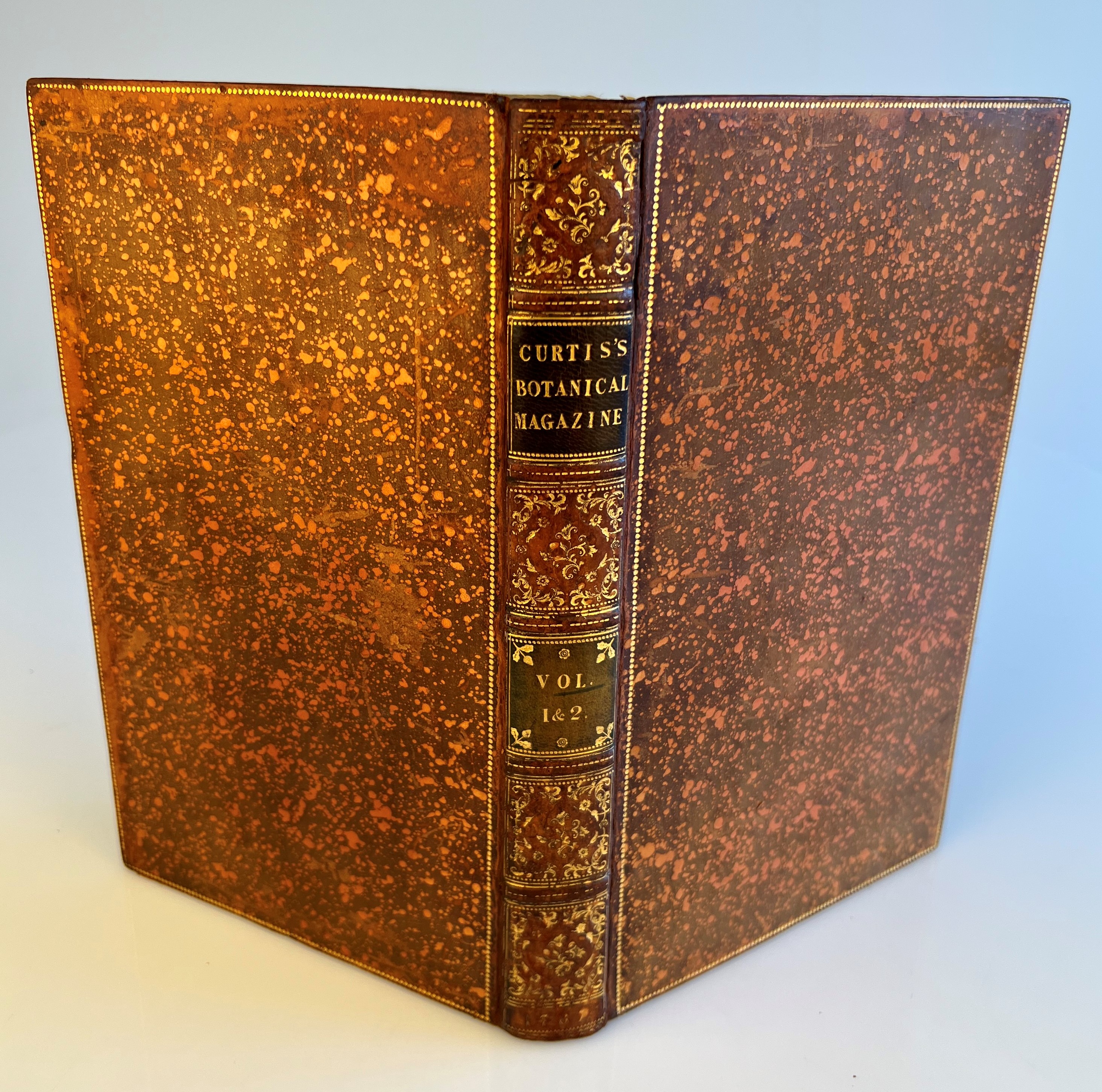 CURTIS, W.: The botanical Magazine, or Flower Garden Displayed. Vol. 1-70, bound in 49. London, S. Couchman. 1787-1844 Octavo 23,5 x 14 cm. With 4138 fine hand-coloured engravings, some folded. Plates 120, 903B, 1605 uncolored, as normal. 3 never bound in missing plates 361-363 in vol XI, plates 553-1075 with entry of the names of the plants with ink or pencil in old hand. From plate 3776 as usual somewhat browned, since from 1840 other paper was used for the plates. The white front and endpapers somewhat foxed, some vols partly with browned leaves as normal for this serial, the rest very clean and in excellent condition. Contemporary full tan calf, spine richly gilded, marbled sides fitted to the marbled endpapers. Overall condition very good with a little general wear, some vols with partly broken joints but without loss of stability. All volumes with bookplate on the front inside cover.