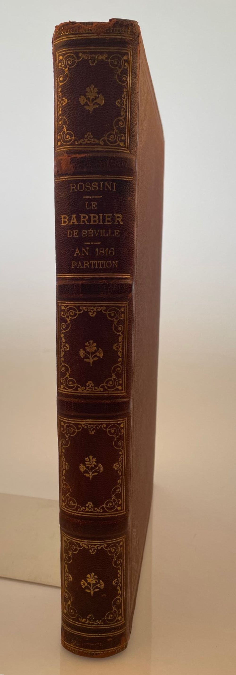 ROSSINI, [G.]: Le Barbier de Séville, ou la Précaution inutile, Opéra Comique en quatre Actes, d'aprés Beaumarchais et le Drame Italien, Paroles ajustées ... par M. Castil-Blaze. Prix: 60f. [Partitur full score]. Paris, La Lyre Moderne, Magasin de Musique et d'Instrumens (PlattenNr. 346) [1821] Folio. 1 f., 393 pp. Title reinforced at fold. Publisher's stamp and handwritten entry. 1 leaf with small burn hole. Partly browned and somewhat foxed. Initially just trimmed.Titel im Falz verstärkt. Verlegerstempel und handschriftlicher Eintrag. 1 Bl. mit kleinem Brandloch. Teils gebräunt und etwas stockfleckig. Anfangs knapp beschnitten. Later half leather binding. Upper capital slightly damaged - Späterer Halblederband. Oberes Kapital leicht beschädigt.
