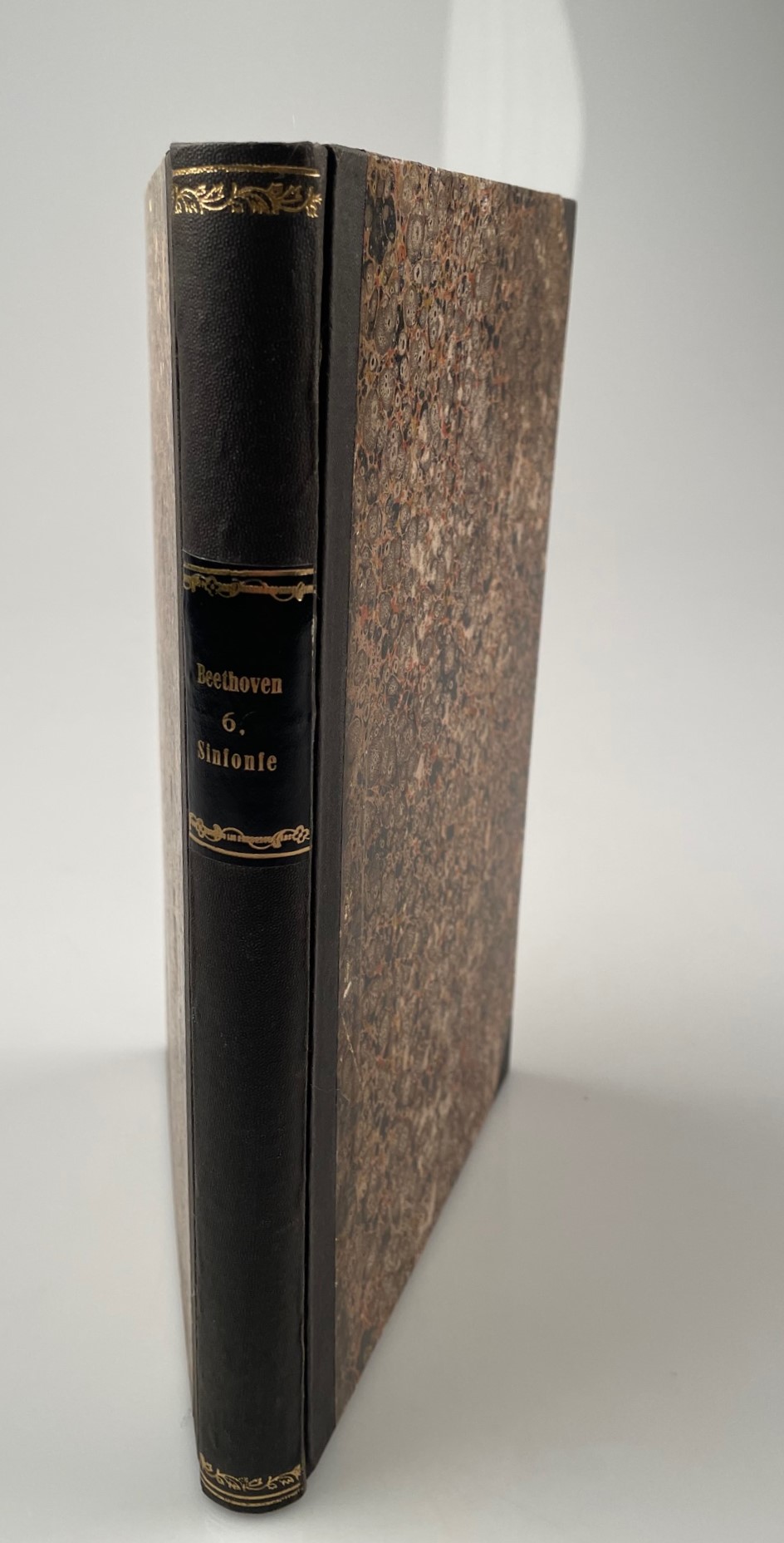 BEETHOVEN, L. v.: Sixième Sinfonie Pastorale en fa majeur: F Dur. Oeuvre 68. Partition. Leipsic Breitkopf & Härtel (PlateN°. 4311) [1826] Quarto. Title page lithographed, 188 pp. Small publisher's stamp - Kleiner Verlegerstempel. Partly somewhat foxed - Teils etwas stockfleckig. Half cloth binding with contemporary coloured paper - Halbleinenband mit zeitgenössischem Buntpapier.