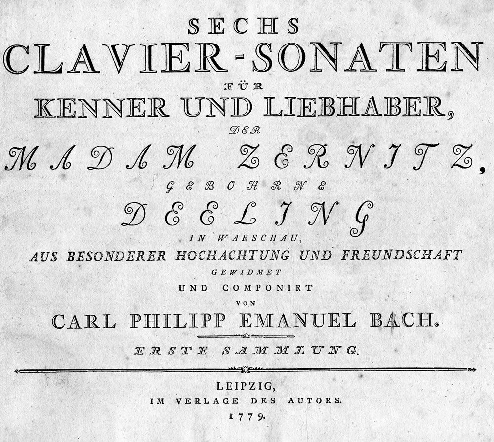 Erstausgabe der Sammlung aller sechs Klaviersonaten "für Kenner und Liebhaber" in Typendruck. Äußerst selten in dieser Vollständigkeit. - Der zweitälteste Sohn J. S. Bachs (1714-1788) lebte viele Jahre als Cembalo-Virtuose Friedrichs des Großen am Berliner Hof und später als Kantor und Musikdirektor in Hamburg, wo auch die Sonaten entstanden sind. Sein Einfluß auf die Entwicklung des Klavierstils ist nicht hoch genug einzuschätzen, seine Verdienste um das Musikleben seiner Zeit enorm. Dementsprechend besaß er bereits zu Lebzeiten eine herausragende Stellung bei seinen Zeitgenossen, wie das Pränumeranten-Verzeichnis der Sonaten zeigt (u. a. Burney, Kirnberger, Marpurg, Schubart und Türk). - Die einzelnen Hefte, jeweils in Typendruck, wurden in der Breitkopfischen Offizin hergestellt. Die Sammlungen 1-3 liegen in der Ausgabe mit Diskantschlüssel (statt Violinschlüssel) vor. Beide Ausgaben sind gleichzeitig erschienen. - Hoboken 190, 192, 195, 196, 198, 201; RISM B 85, 87, 88, 90, 91, 93; Helm S. 262 f.