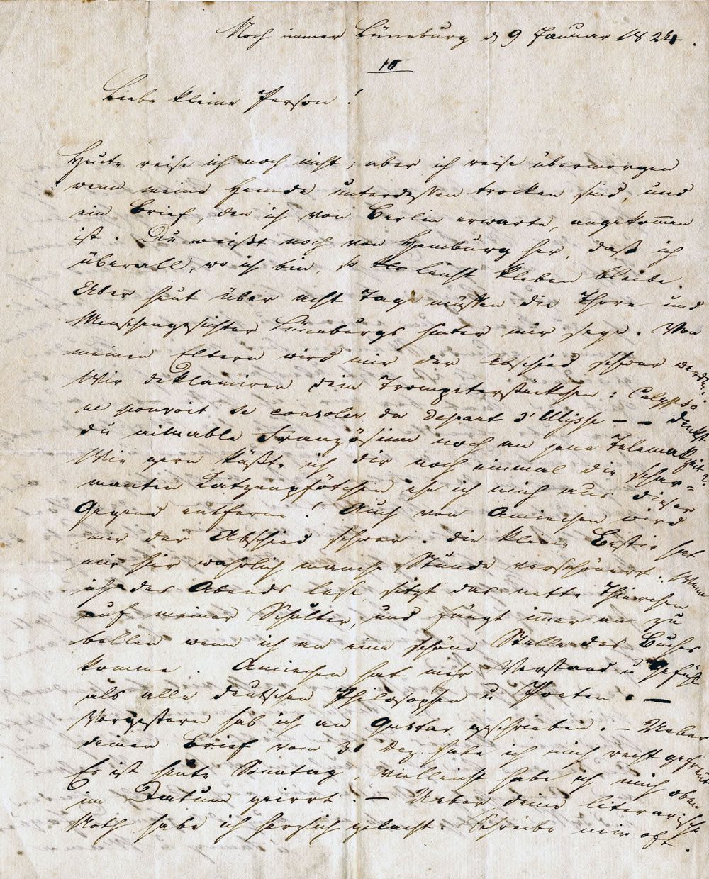 "Liebe kleine Person! Heute reise ich noch nicht; aber ich reise übermorgen wenn meine Hemde unterdessen trocken sind, und ein Brief, den ich von Berlin erwarte, angekommen ist. Du weißt noch von Hamburg her, daß ich überall, wo ich bin, so leicht kleben bleibe. Aber heut über acht Tag müssen die Thore und Menschengesichter Lüneburgs hinter mir seyn. Von meinen Eltern wird mir der Abschied schwer werden. Wir deklamiren Dein Trompeterstückchen: Calypso ne pouvoit se consoler du depart d’Ulysse - - Denkst Du aimable Französinn noch an jene Telemakzeit? Wie gern küßte ich Dir noch einmal die scharmanten Katzenpfötchen ehe ich mich aus dieser Gegend entferne! Auch von Amiechen wird mir der Abschied schwer. Die kleine Bestie hat mir hier wahrlich manche Stunde verschönert. Wenn ich des Abends lese sitzt das nette Thierchen auf meiner Schulter, und fängt immer an zu bellen wenn ich an eine schöne Stelle des Buches komme. Amiechen hat mehr Verstand u Gefühl als alle deutschen Philosophen u Poeten. - Vorgestern hab ich an Gustav geschrieben. - Ueber Deinen Brief vom 31 Dez habe ich mich recht gefreut. Es ist heute Sonntag, vielleicht habe ich mich oben im Datum geirrt. - Ueber Deine literarische Noth habe ich herzlich gelacht. Schreibe mir oft. Daß ich an einem Trauerspiel arbeite, wie man Dir berichtet, hat nicht ganz seine Richtigkeit. Ich habe nemlich noch keine Zeile davon geschrieben, und das Stück existirt bis jetzt bloß in meinem Kopfe; wo noch manche andere Stücke und noch viele gute Bücher bereit liegen. Aber jetzt bin ich zu krank um etwas zu schreiben und meine wenigen gesunden Stunden sind meinen Studien gewidmet. Es ist jetzt überhaupt noch immer die Zeit der Saat bey mir; ich hoffe aber auf eine gute Erndte. Ich suche die verschiedenartigsten Kenntnisse in mir aufzunehmen u werde mich in der Folge desto vielseitiger u ausgebildeter als Schriftsteller zeigen. Der Poet ist bloß ein kleiner Theil von mir; ich glaube Du kennst mich hinlänglich um dieses zu begreifen. Deinen Rath recht viele in meinem Trauerspiel sterben zu lassen hab ich mir bemerkt. Ach Gott, ich wollte ich könnte alle meine Feinde darinn sterben lassen. Den Pfuscher grüße mir recht viele tausendmahl. Wiederhole ihm die Versicherung meiner Freundschaft. Wer mein kleines Lottchen liebt den liebe ich auch. Außerdem bin ich ja auch ein großer Verehrer von Archenholz. Grüße mir auch Adolf Emden und dessen Lottchen, so wie auch die Familie Jaques u Fanny u Mama." (Der anschließende Briefteil fehlt.) "Ich hoffe, liebes Lottchen, daß Du mir in Göttingen viele liebe Briefchen zukommen lassen wirst; jedes derselben erheitert meine Seele. Alles was Du schreibst ist so lieb u klar; wie ein reiner Spiegel, zeigt mir jede Zeile Dein gutes Originalgemüth. Lebe wohl u behalte mich lieb H. Heine." - Erläuterungen: "Brief": von seinem engen Freund, dem Bankangestellten Moses Moser, den Heine um Übersendung eines Abgangszeugnisses der Berliner Universität gebeten hatte, das er für die Fortsetzung seines Studiums in Göttingen benötigte. - "Calypso": Fénelon, Les aventures de Telemaque, fils d’Ulysse, 1699. - "Trauerspiel": Heine wollte ein Drama in fünf Akten schreiben, dessen Handlung in Venedig spielen sollte. Er gab den Plan jedoch im Herbst des Jahres auf. - "Pfuscher": Charlottes Ehemann, Moritz Embden. - "Archenholz": der Historiker und Schriftsteller Johann Wilhelm von A., 1743-1812. - "Familie Jaques u Fanny u Mama": die Familie des Kaufmanns Theodor Jacques und seiner Ehefrau Emilie geb. Embden; mit Mama ist Esther Embden geb. Cohen, die Mutter von Adolph und Moritz Embden, gemeint; Fanny ist Heines Cousine, die zweite Tochter Salomon Heines, seit 1818 mit dem Arzt Christian Wilhelm Schröder verheiratet. - In der Säkularausgabe Band 20 unter Nr. 90 nach einer Photokopie gedruckt; der fehlende Briefteil war schon damals nicht mehr vorhanden.