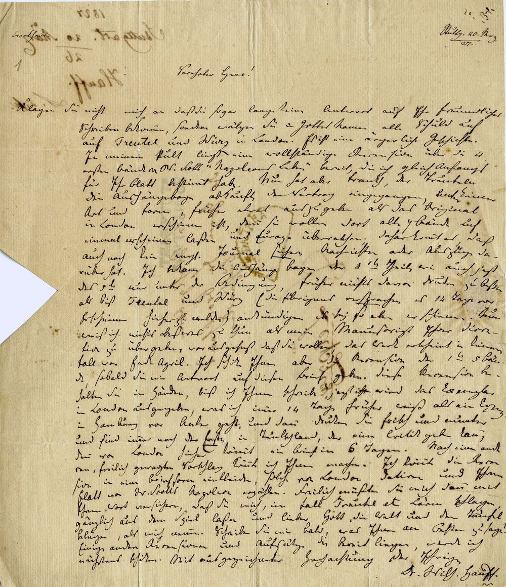 „Der schwäbische Walter Scott“ bietet im Dezember 1826 dem Verleger Friedrich Brockhaus sechs Beiträge für die „Blätter für literarische Unterhaltung“ an. Am 5. Januar und am 20. Februar bittet Brockhaus Hauff ihm endlich den angebotenen Aufsatz über das „Leben Napoleons“ von Walter Scott zu übersenden. Wilhelm Hauff antwortet jedoch erst am 20. März mit folgendem Brief: