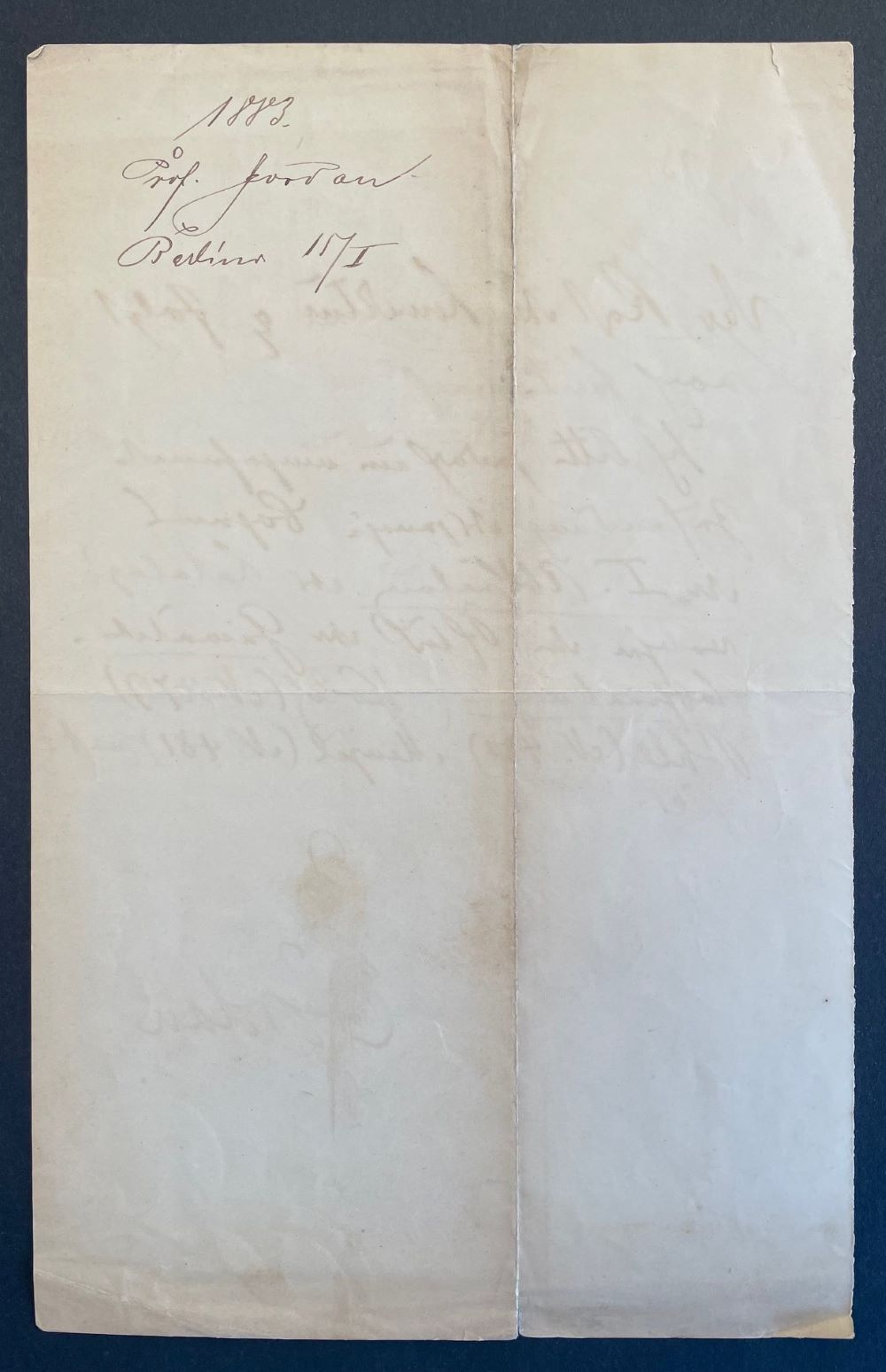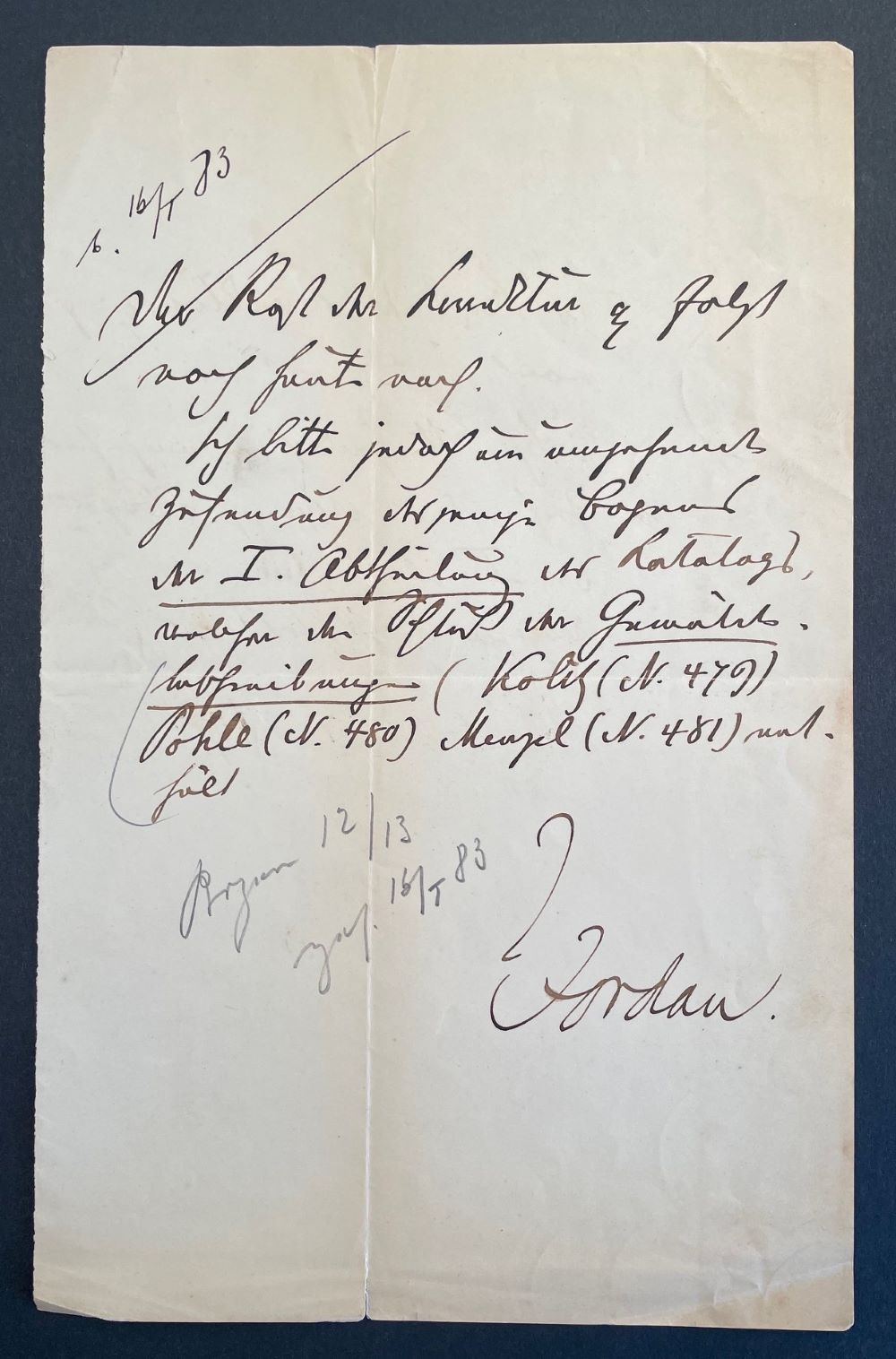 Brief an die Offizin W. Drugulin bezüglich der Bogenaufteilung des "Katalogs der königlichen National-Galerie zu Berlin. Festausgabe mit 50 Illustrationen", der 1883 erschien,