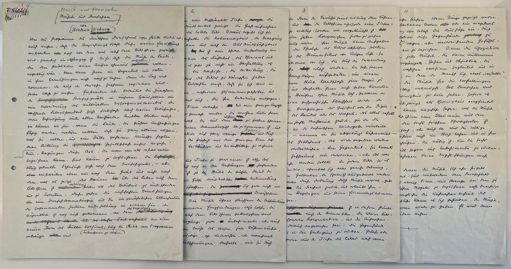 SIEBURG, Friedrich [1893-1964]: Eigenhändiges Manuskript - autograph manuscript "Musik und Fernsehen". [ca. 1955]. Folio 30 x 21cm. 4 pages on 4 leaves in blue ink with corrections in ink and pencil.