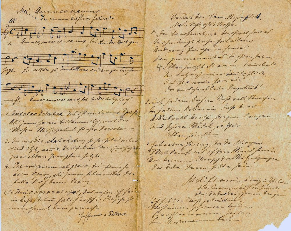 HOFFMANN von FALLERSLEBEN, August Heinrich [1798-1874]: 4 Liedtexte von Schreiberhand mit Unterschrift von Schreiberhand, z.T. mit Melodien. [Um 1850]. 1 Blatt (16 x 20,5 cm), gefalzt, braunes Papier, eine Ecke geringfügig lädiert. Randeinrisse.