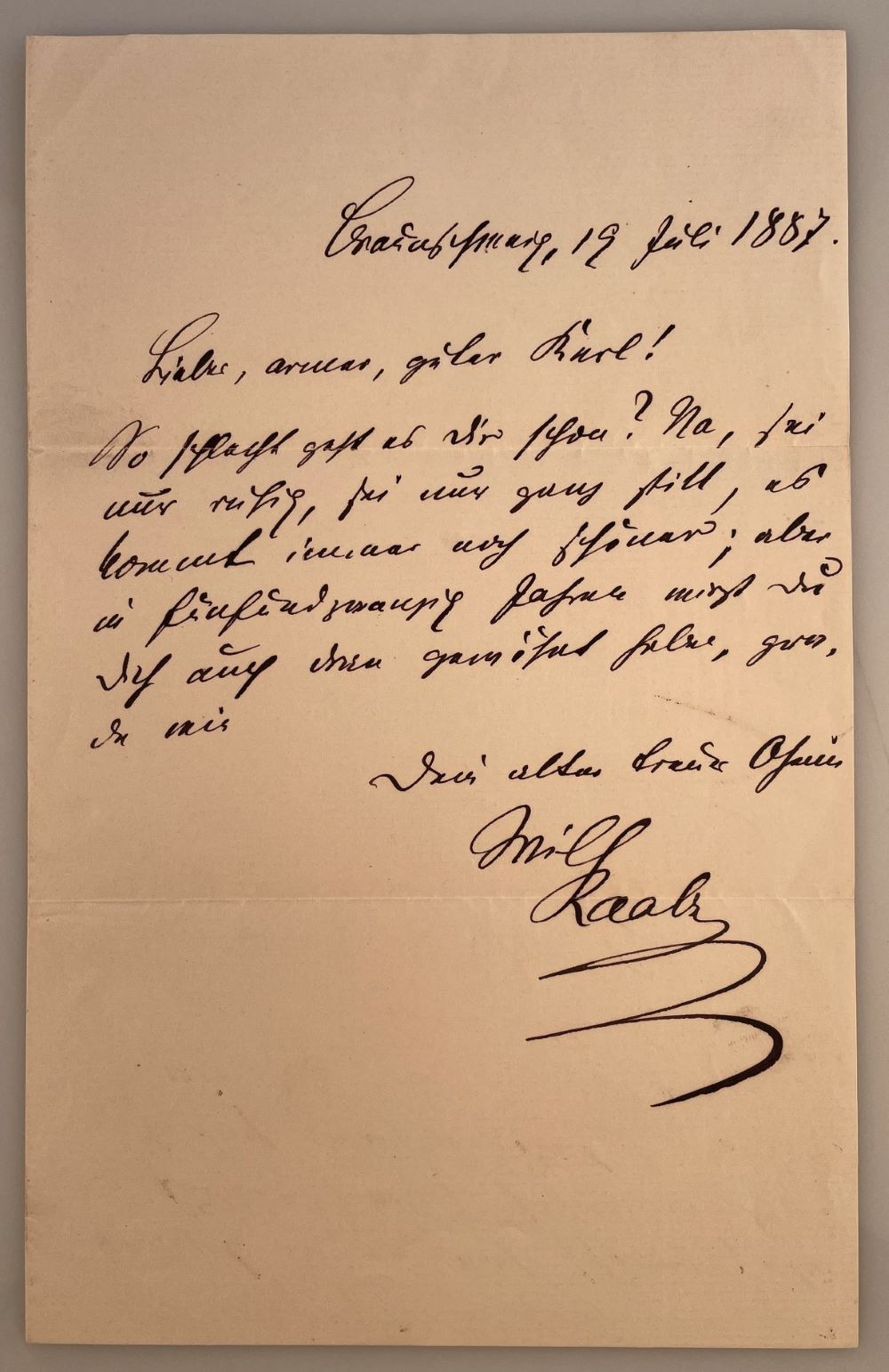 RAABE, Wilhelm [1831-1910]: Eigenhändiger Brief mit Datum und Unterschrift. Braunschweig, 19. Juli 1887. Großoktav. 1/2 Seite. 22x14 cm. Minimale Falzeinrisse.