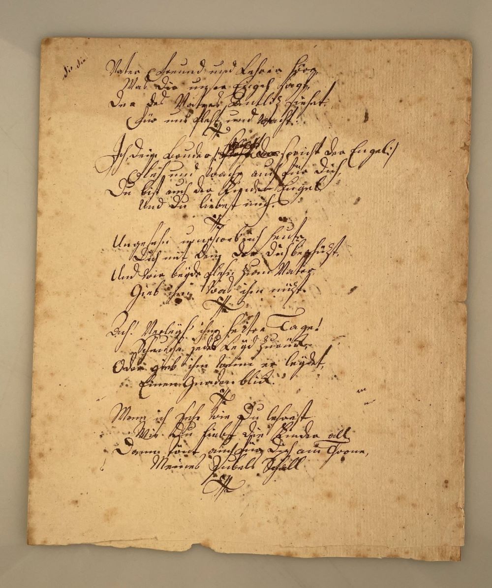 Während seines Medizinstudiums (1770-72) in Straßburg lernte er Goethe, Herder, Lenz und Salzmann kennen. Auf Anregung von Goethe schrieb Jung-Stilling seine Autobiographie, die das Interesse der Sturm-und-Drang-Generation erregte. Ab 1772 wandte er sich vorwiegend der Medizin zu und machte sich schnell als erfolgreicher Augenarzt europaweit einen Namen (er führte ca. 2000 Staroperationen durch). Ab 1808 war er "Geheimer Hofrat" am Badischen Hof in Karlsruhe. - Im Anschluss an das Gedicht ein Sammlervermerk von alter Hand: "geschrieben von dem berühmten u. von mir hochverehrten u. geliebten Hofrath Jung genannt Stilling". - Gedicht-Handschriften Jung-Stillings sind sehr selten im Handel, seit über 30 Jahren wurden keine weitere angeboten.