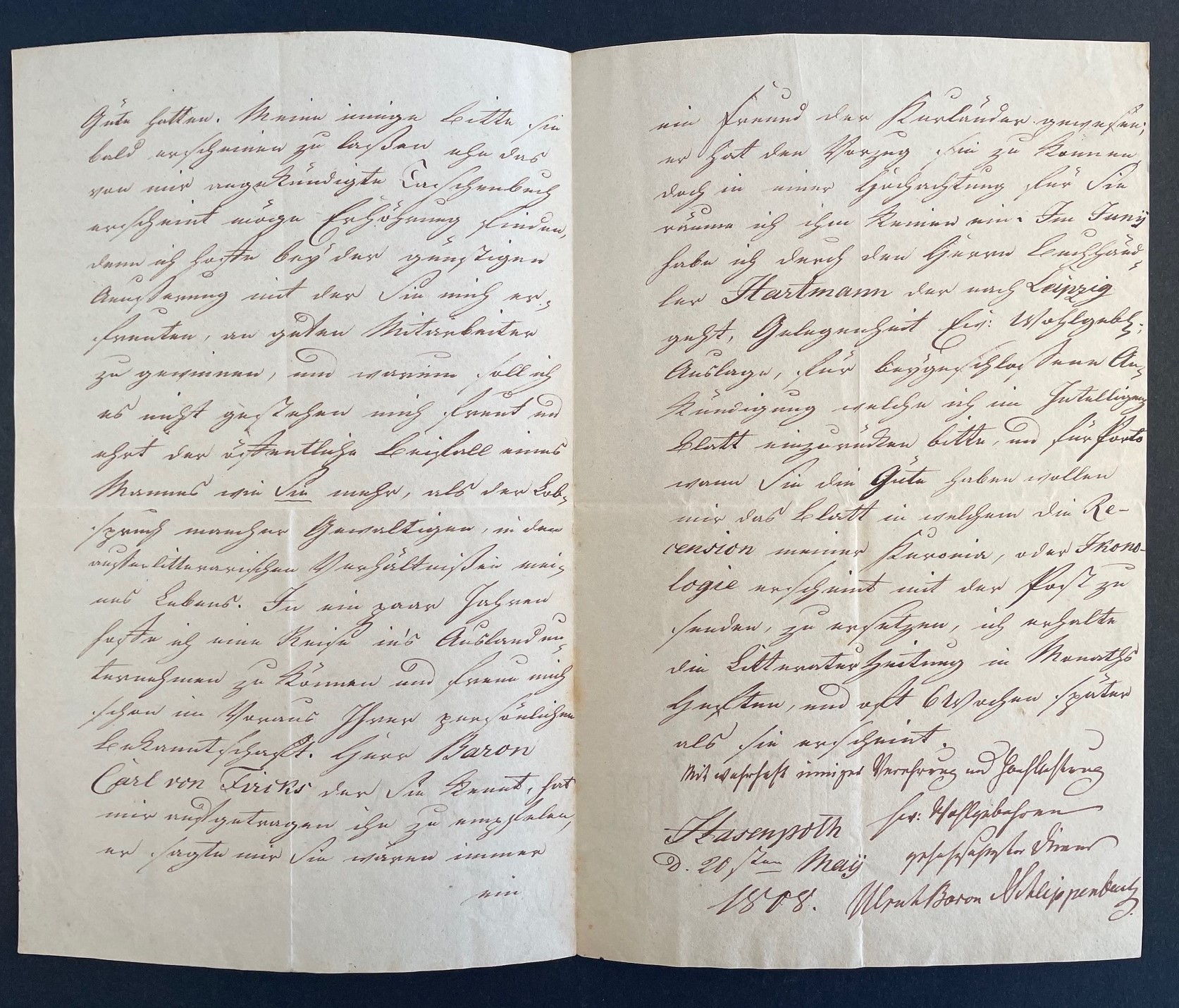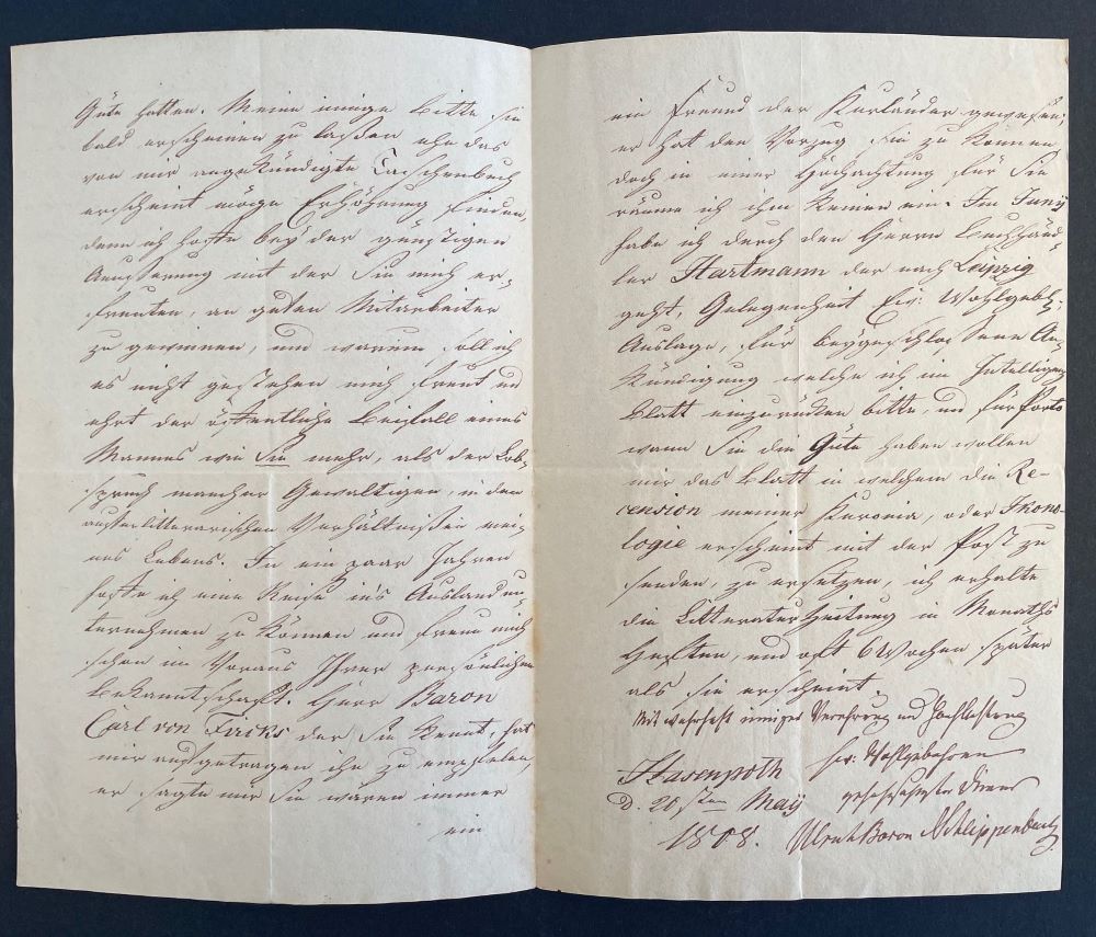 Umfangreicher Brief des kurländischen Politikers und Schriftstellers Ulrich Freiherr von Schlippenbach, der zu seiner Zeit einer der beliebtesten Dichter der baltischen Provinzen war. "Ew. Wohlgeboren schreiben mir wegen der Anstellung eines jungen Mannes hier in Rußland, genug um mein wärmstes Interesse für ihn bey mir zu erregen. Da Herrn General Lieutenant von [Friedrich Maximilian von] Klinger den ich von Petersburg aus kenne im Juny zur Revision der Schulen nach Kurland kommt so bitte ich mir nähere Nachricht recht bald mitzutheilen, damit ich mit ihm selbst mündlich sprechen kann. In den Monaths Heften der Hallischen Litteratur Zeitung vom Maertz und April habe ich vergeblich die Recension der Kuronia gesucht, welche Sie mir zu versprechen die Güte hatten. Meine innige Bitte sie bald erscheinen zu lassen ehe das von mir angekündigte Taschenbuch erscheint möge Erhörung finden. ... Im Juni habe ich durch den Herrn Buchhändler Hartmann der nach Leipzig geht, Gelegenheit Ew. Wohlgeb. Auslage, für beygeschloßene Ankündigung welche ich im Intelligenz Blatt einzurücken bitte, und für Porto wann Sie die Güte haben wollen mir das Blatt in welchem die Recension meiner Kuronia [eine Sammlung vaterländischer Gedichte], oder Ikonologie erscheint mit der Post zu senden...". - Schlippenbach stand mit vielen deutschen Schriftstellern in lebhaftem Briefwechsel.