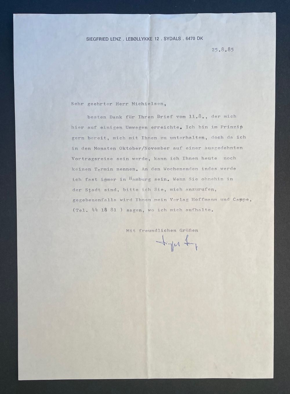 Antwortschreiben an den niederländischen Journalisten und Publizisten Peter Michielsen (1946-2008), der Lenz um einen Termin gebeten hatte. " ... Ich bin im Prinzip gern bereit, mich mit Ihnen zu unterhalten, doch da ich in den Monaten Oktober/November auf einer ausgedehnten Vortragsreise sein werde, kann ich Ihnen noch keinen Termin nennen. An den Wochenenden indes werde ich fast immer in Hamburg sein. Wenn Sie ohnehin in der Stadt sind, bitte ich Sie, mich anzurufen, gegebenenfalls wird Ihnen mein Verlag Hoffmann und Campe ... sagen, wo ich mich aufhalte".