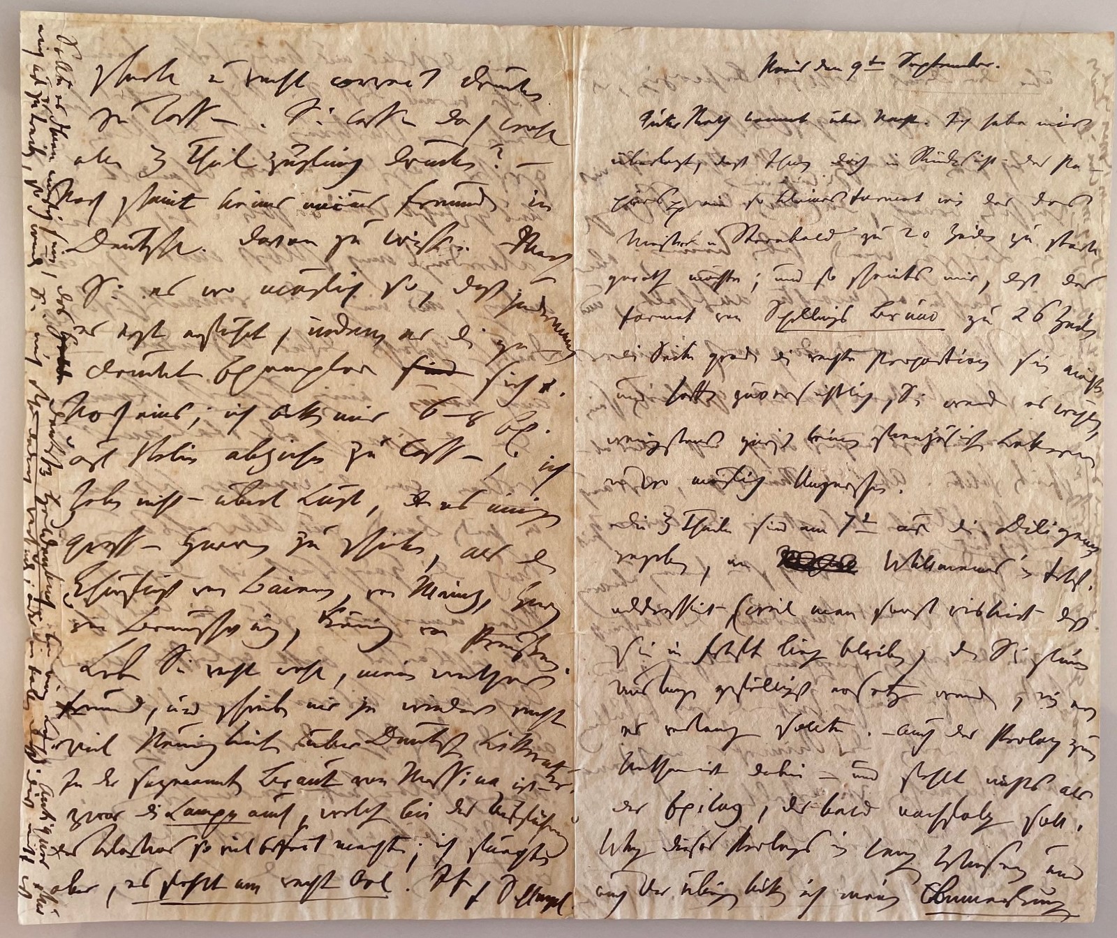 SCHLEGEL, Friedrich von [1772-1829]: Eigenhändiger Brief mit Unterschrift. Paris, 9. September [1803]. Oktav. 4 Seiten. 19,5 x 23,5 cm. Doppelbogen. Leicht fleckig.