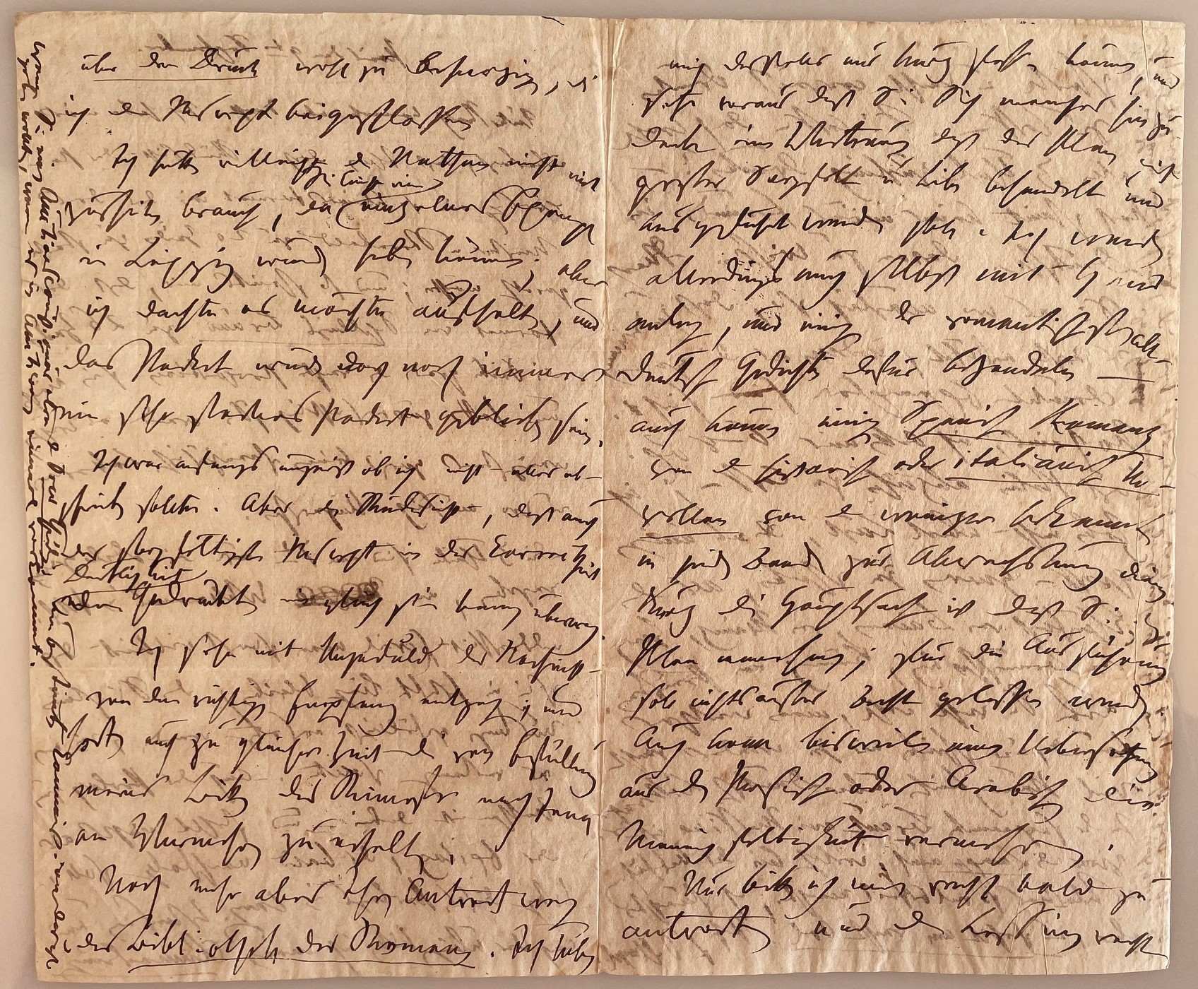 Schöner, inhaltsreicher Brief an den Schriftsteller, Verleger und Inhaber der Juniusischen Buchhandlung in Leipzig, August Mahlmann (1771-1826), über den bevorstehenden Druck von "Lessings Gedanken und Meinungen aus dessen Schriften" die er in 3 Bänden herausgab. Diese Anthologie stellt das bedeutendste Zeugnis für Schlegels Beschäftigung mit Lessing dar, wo er eine umfangreiche Auswahl von Schriften, Briefen und Dichtungen mit Einleitungen und Zusätzen des Herausgebers vereint. "Guter Rath kommt über Nacht. Ich habe mir überlegt, daß Ihnen doch in Rücksicht des Papiers etc. ein so kleines Format wie das des [Wilhelm] Meister u. [Franz] Sternbald zu 20 Zeilen zu stark gerathen möchte; und so scheints mir, daß das Format von Schellings Bruno zu 26 Zeilen die Seite grade die richtige Proportion sein möchte und hoffe zuversichtlich, Sie werden es wählen, wenigstens gewiß keine französischen Lettern u. wo möglich Ungersche. Die 3 Theile sind am 7t auf die Diligence gegeben, an Willemer'n in Frkft. addressiert ... Auch der Prolog zum Nathan ist dabei - und fehlt nichts als der Epilog, der bald nachfolgen soll ...". Dringend erwarte er "Antwort wegen der Bibliothek der Romane. Ich habe mich deshalb nur kurz fassen können, und setze voraus daß Sie Sich manches hinzu denken im Vertrauen daß der Plan mit großer Sorgfalt u. Liebe behandelt und ausgeführt werden soll. Ich werde allerdings auch selbst mit Hand anlegen, und einige der romantischsten altdeutschen Gedichte dafür behandeln - auch können einige Spanischen Romanzen ... oder italiänischen Novellen ... in jedem Band zur Abwechslung dienen. ... Auch hier kann bisweilen eine Uebersetzung aus dem Persischen oder Arabischen die Mannigfaltigkeit vermehren ...". Von der Lessingausgabe erbittet er "6-8 Ex. auf Velin ... ich habe nicht übel Lust, es einigen grossen Herren zu schicken, als den Churfürsten von Baiern, von Mainz, Herz. von Braunschweig, König von Preußen ... Leben Sie recht wohl ... und schreiben mir ja wieder recht viel Neuigkeiten über Deutsche Litteratur. In der sogenannten Braut von Messina ist zwar die Lampe auch, welche bei der Aufführung des Werkes so viel Effect machte; ich fürchte aber, es fehlt am rechten Oel!". - Schillers Tragödie war am 19. März 1803 in Weimar uraufgeführt worden. Bereits 1797 hatten die Schlegels mit Schiller gebrochen, nachdem sie scharfe Kritik an dessen Gedichten im "Musenalmanach auf das Jahr 1796" geübt hatten. Die erst im Jahr 1802 geknüfte Verbindung zu August Mahlmann war nur von kurzer Dauer. Die Juniusische Buchhandlung hatte Mahlmann erst 1802 gekauft und musste diese schon im Januar 1806 aus Geldmangel wieder aufgeben. Aus Coppet in der Schweiz schrieb Schlegel am 5. November 1804 an Helmina von Hastfer: "Mahlmann hat mich so wiederholt hintergangen und um Geld gebracht, daß ich gar nichts mehr mit ihm zu tun haben mag." - Teilweise unveröffentlicht und nicht ediert in Band 26, I der 3. Abteilung der Kritischen Friedrich-Schlegel-Ausgabe (KFSA) Hg. v. Hans Dierckes, 2018.