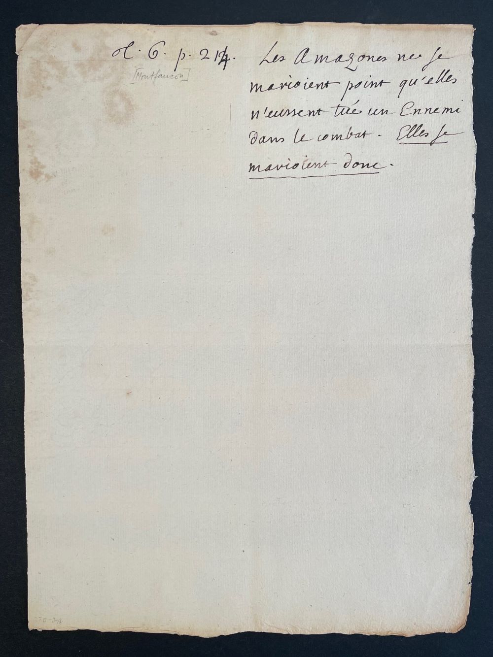 Vorarbeiten zu einem von seiner Gönnerin Louise-Marie-Madeleine Dupin (1706-1799) beabsichtigen Werk "Ouvrage sur les femmes", an dem beide ab 1745 bis 1751 arbeiteten, welches jedoch nie veröffentlicht wurde. Rousseaus Aufgabe war es, Notizen zu machen und Nachforschungen für das projezierte Buch anzustellen. Er schrieb seinen Text in die rechte Spalte der Seite, die linke war für zusätzliche Notizen gedacht. Die von Rousseau und seiner Arbeitgeberin verfassten Forschungsnotizen, Entwürfe und Reinschriften wurden im Schloss von Chenonceaux aufbewahrt und gerieten im Wesentlichen in Vergessenheit, bis sie bei einer Reihe von Auktionen zwischen 1951 und 1958 verkauft wurden" (Website des Harry Ransom Centre, University of Texas in Austin, das einen bedeutenden Teil des Manuskripts besitzt). Interessanterweise steht dieses frühe Projekt in deutlichem Kontrast zu Rousseaus späteren, ausgesprochen unaufgeklärten Ansichten über Frauen. Das vorliegende Manuskript beschreibt ein Ritual der Amazonen: "Les Amazones ne se marioient point qu'elles n'eussent tué un Ennemi dans le combat. ("Die Amazonen heirateten nicht, bevor sie nicht einen Feind im Kampf getötet hatten.") Elles se marioient donc." Am Kopf links bezeichnet "T.6.p.214"; Dieses Zitat stammt aus dem Werk "L'Antiquité Expliquée et Représentée", erschienen in Paris 1719 des Paläographen Bernard de Montfaucon. Rousseaus zusätzliche Notiz: "Elles se marioinent donc" ("Sie verheirateten sich also") ist unterstrichen. Louise Dupin etablierte in Paris einen literarischen Salon, in dem sie die führenden Aufklärer Frankreichs versammelte, u.a. Voltaire, Montesquieu und Buffon. J.J. Rousseau engagierte sie Anfang der 1740-er Jahre als Erzieher ihres Sohnes, später wurde er ihr Privatsekretär. Rousseau selbst berichtete, dass er sehr verliebt in die weltgewandte Salonière gewesen sei; in seinen "Bekenntnissen" setzte er Louise Dupin, der Stiefgroßmutter von Georges Sand, ein bleibendes Denkmal.
