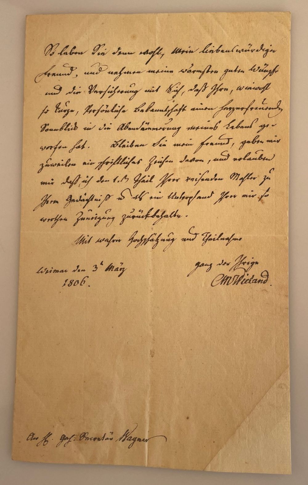 Persönliches, warmherziges Schreiben an Johann Ernst Wagner (1769-1812), Dichter aus Meiningen, der durch die Vermittlung von Jean Paul 1804 Kabinettssekretär bei Herzog Georg von Meiningen wurde. Anfang 1806 reiste Wagner wegen eines schweren Nervenleidens nach Weimar und suchte dort den Arzt Christian Stark (Schillers Hausarzt) auf. Während seines Aufenthaltes in der Stadt hatte er eine offenbar herzliche Begegnung mit Wieland, der ihm nach seiner Abreise die folgenden Zeilen schrieb: "So leben Sie denn wohl, mein liebenswürdiger Freund, und nehmen meine wärmsten gute Wünsche und die Versicherung mit Sich, daß Ihre, wiewohl so kurze, persönliche Bekanntschaft einen herzerfreuenden Sinnblick in die Abendämmerung meines Lebens geworfen hat. Bleiben Sie mein Freund, geben mir zuweilen ein schriftliches Zeugnis davon, und erlauben mir, daß ich den 1ten Theil Ihrer reisenden Mahler zu Ihrem Gedächtniß u als Unterpfand Ihrer mir so werthen Zuneigung zurückbehalte. ... ganz der Ihrige CM Wieland". Der Künstlerroman "Die reisenden Maler" erschien 1806 in zwei Teilen bei Göschen in Leipzig. Neben Goethe waren auch 'Franz Sternbalds Wanderungen' von Ludwig Tieck Vorbilder Wagners, dessen Romane zum Grundthema das nach sozialer Harmonie des bürgerlichen Lebens in einer vom Adel beherrschten Gesellschaft hatten. Dem 73-jährigen Wieland, der nach dem Tod seiner geliebten Frau Anna Dorothea im Jahr 1801 weitgehend zurückgezogen lebte, mögen an Wagners Roman vor allem die stimmungsvollen Naturskizzen, die Schilderungen sentimentaler seelischer Erregungszustände und die Studien praktischer Kunsttendenzen gefallen haben (vgl. ADB 40, S. 488). - Gedruckt in Wieland, Briefwechsel Bd. 17, Nr. 35 ("Verbleib unbekannt").