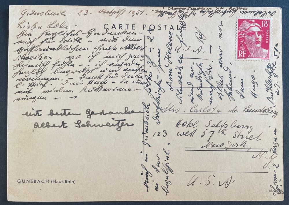 An Carlota de Landsberg, New York, Hotel Salisburg, gerichtet. Zunächst schreibt ihr ein Freund namens "Hugo", dass es sich in Günsbach, im Haus von Albert Schweitzer "ganz heimisch fühlt" und er dort "herzlich begrüßt und aufgenommen" wurde. Darunter die kurzen Grußworte von A. Schweitzer "mit besten Gedanken". - Albert Schweitzer war in Günsbach, im Elsass, aufgewachsen. Sein Vater war dort als Pfarrer tätig. Heute befindet sich im Ort ein Museum und der Sitz der internationalen Albert-Schweitzer-Stiftung (AISL).