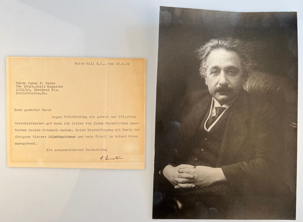 Mit wenigen Worten schildert Einstein James F. Cooke, dem langjährigen Herausgeber des Musikalischen Magazins "The Etude", der ihn um einen Beitrag in seiner Zeitschrift gebeten hatte, seine Beziehung zur Musik: " ... Wegen Überbürdung mit Arbeit und Pflichten verschiedenster Art kann ich leider von Ihrem freundlichen Anerbieten keinen Gebrauch machen. Meine Beschäftigung mit Musik ist übrigens blosser Dilettantismus und mein Urteil in keiner Weise maßgebend. ..."