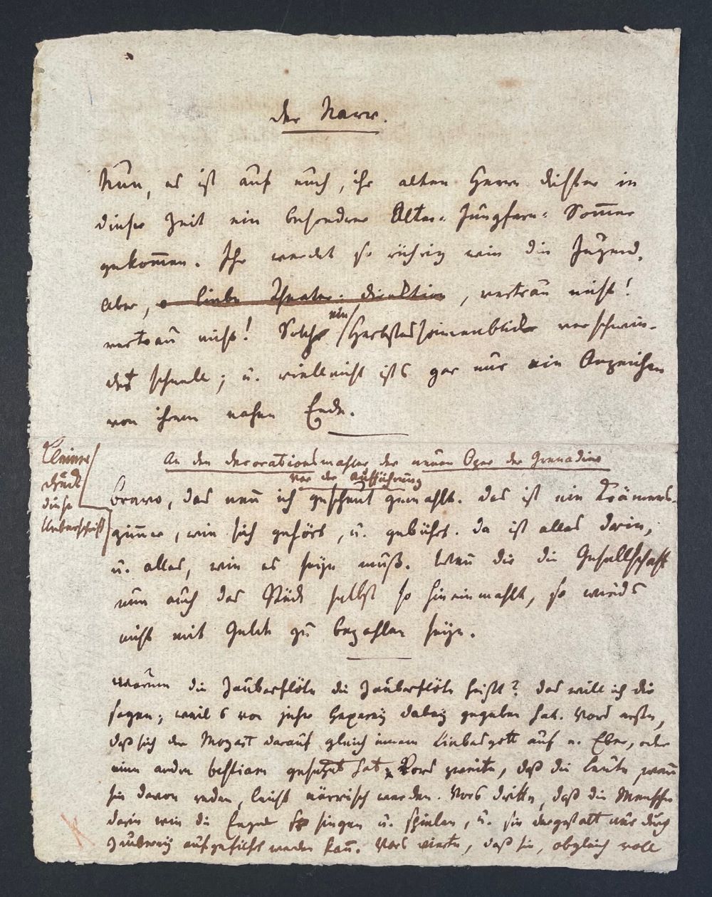 Bravo, das nenn ich gescheut gemahlt. Das ist ein Krämerszimmer wie es sich gehört, u. gebührt. Da ist alles drin, und alles, wie es seyn muss. Wenn dir die Gesellschaft nun auch das Stück selbst so hineinmahlt, so würd's nicht mit Geld zu bezahlen seyn." Am Rand die Anweisung für den Setzer "kleinerer Druck dieser Unterschrift". "Der Grenadier oder die Medaille" ist ein Singspiel in einem Akt vom damaligen Kapellmeister des k.k. Hoftheaters Michael Umlauf (1781-1842), das am 8. Juli 1812 in Wien uraufgeführt wurde. Das Libretto entstand nach einer wahren Anekdote von Josph Michael Babo.