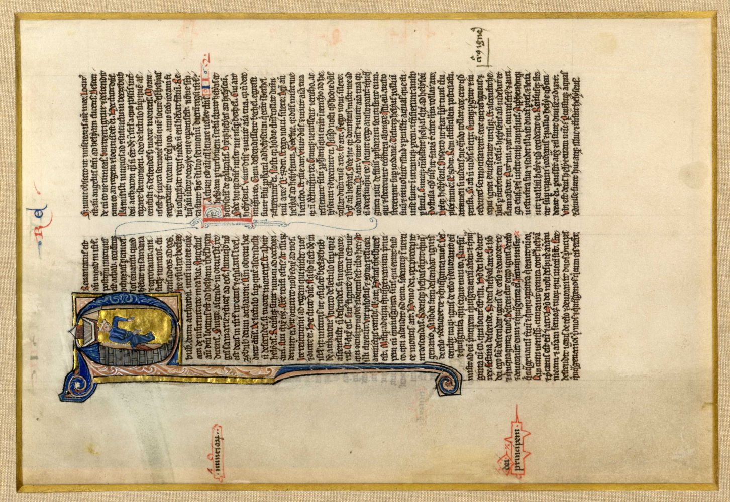 Lateinische Handschrift 53-zeilig mit Bildinitiale "P" in feinster gotischer Buchmalerei (Beg. 3. Buch Könige). Pergamenthandschrift Frankreich um 1300 25x17,5 cm. Passepartout. In Goldrahmen