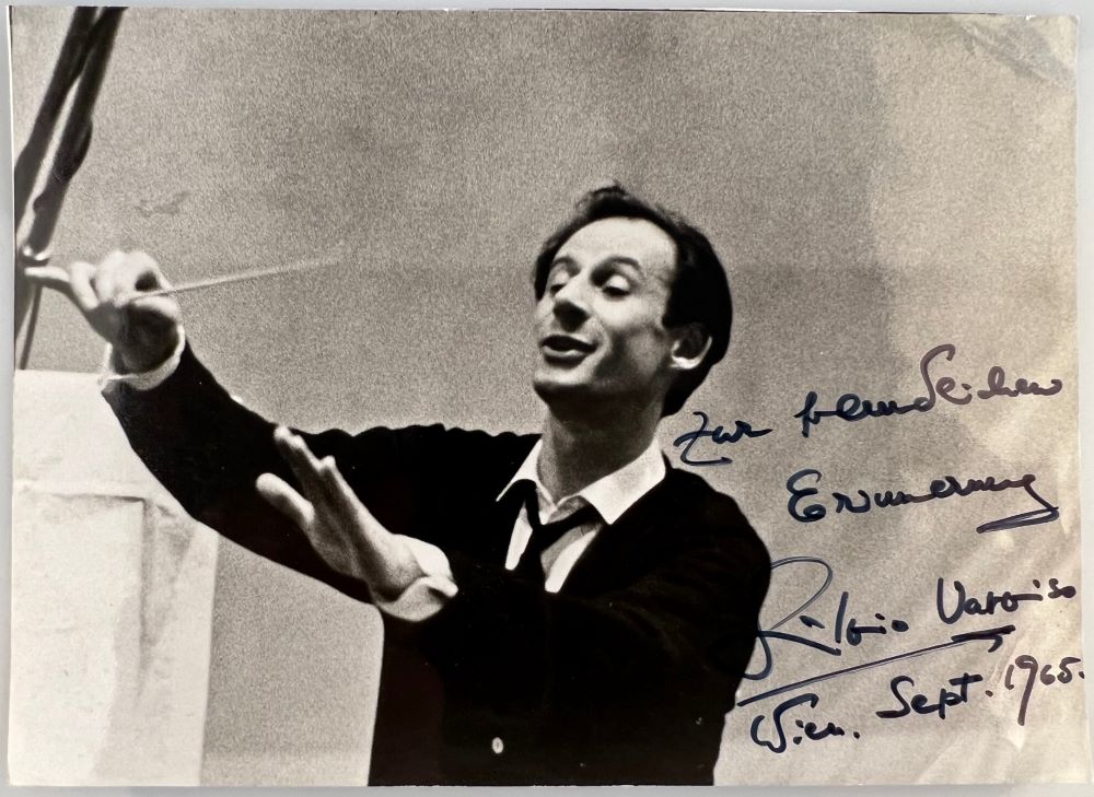 VARVISO, Silvio [1924-2006]: Original-Photographie. Momentaufnahme beim Dirigieren. Mit eigenhändiger Widmung, Ort, Datum und Unterschrift. - Original photograph. Snapshot while conducting. With autograph dedication, place, date and signature. "Wien Sept. 1965''. 17,5 x 12,5 cm.