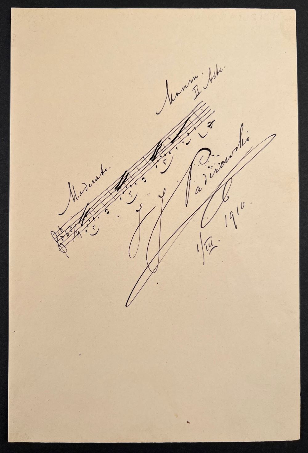4 bars from the 2nd act of his opera "Manru," which was successfully premiered in Dresden in 1901 and had cemented his reputation as a composer. In the 1901/02 season, the work was performed on numerous major stages in the United States. Paderewski was not only a successful composer, but also made a name for himself as a pianist and charismatic politician. He became Polish foreign minister and chairman of the Council of Ministers in 1919 and signed the Treaty of Versailles for Poland on June 28.