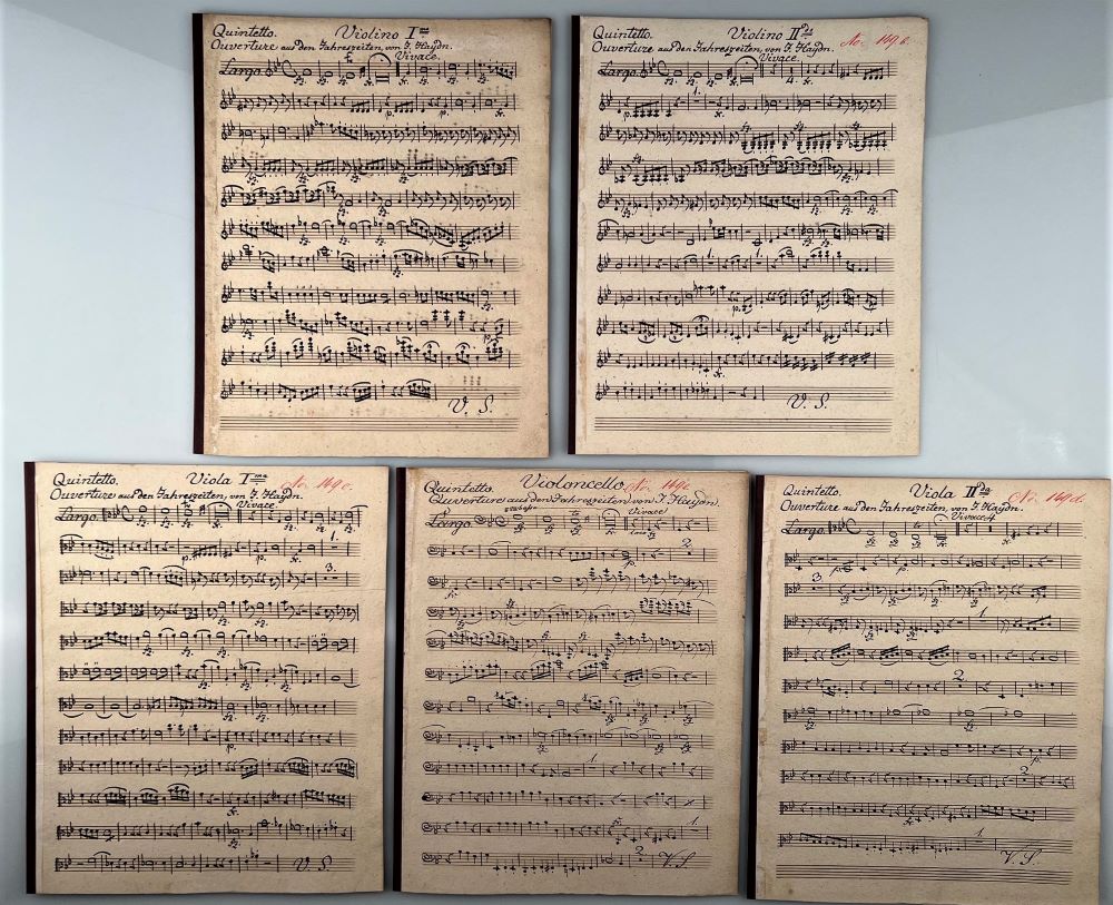 HAYDN, Joseph: Die Jahreszeiten. Ouverture. Rezitativ. Chor des Landvolks. Streicher-Quintett. [Hob. XXI, Nr. 3]. Contemporary manuscript of the string Quintett. [Nach 1844]. 29 x 23cm. 6, 5, 5, 5, 5 pp.
