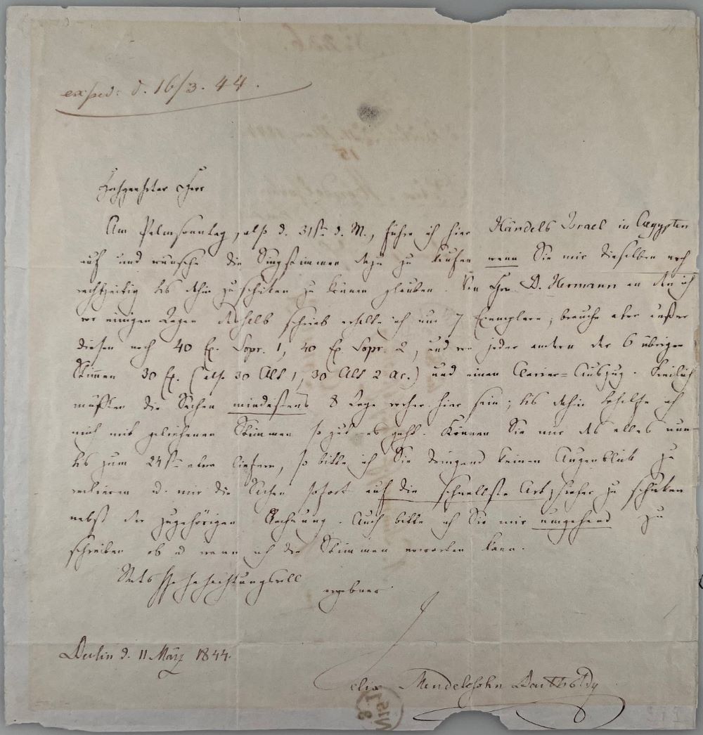 Mendelssohns Expressbestellung für weitere Stimmen lautet in Auszügen wie folgt: "Am Palmsonntag, also d. 31. d. M. ... führe ich hier Händels 'Israel in Aegypten' [Oratorium in 3 Akten] auf und wünsche die Singstimmen dazu zu kaufen wenn Sie mir diesselbe noch rechtzeitig ... schicken ... brauche aber ... noch 40 Ex. Sopr. 1, 40 Ex. Sopr. 2, und von jeder anderen der 6 übrigen Stimmen 30 Ex. ... und einen Clavier=Auszug. ... Freilich müssten die Sachen mindestens 8 Tage vorher hier sein; bis dahin behelfe ich mich mit geliehenen Stimmen so gut es geht. Können Sie mir das allesnun bis zum 24sten etwa liefern, so bitte ich Sie dringend keinen Augenblick zu verlieren und mir die Sachen sofort auf die schnellste Art hierher zu schicken nebst der zugehörigen Rechnung. ...". - In FMB Sämtliche Briefe, Bd. 10, Nr. 4338 nur partiell veröffentlicht.