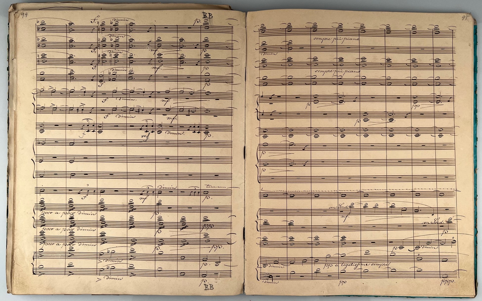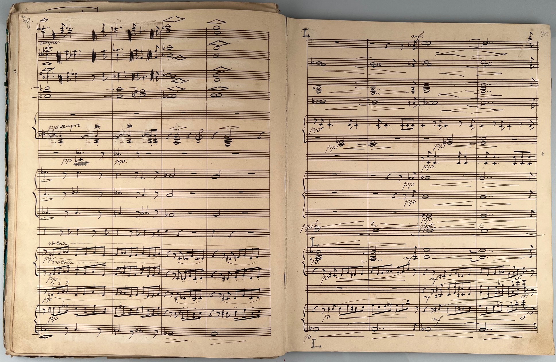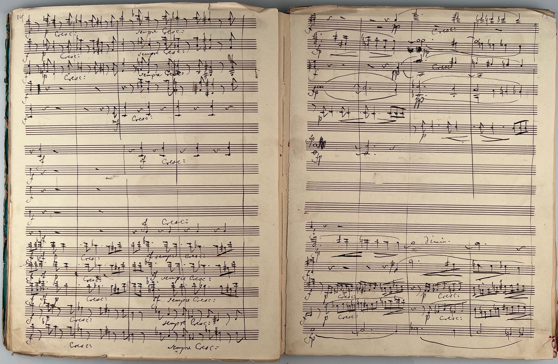 This manuscript is the last revised version of the Hamlet Overture and was extensively edited by Joseph Joachim as printing template mainly in ink, little in pencil. Both the title label and the title are by his hand. There are numerous corrections, additions, revisions and deletions by the composer in his own hand. Pages 14, 15, and 28-34 are written entirely in Joachim's hand and inserted into the score - some loose, some pasted into the manuscript. On some pages there are corrections on music paper pasted over the original score.