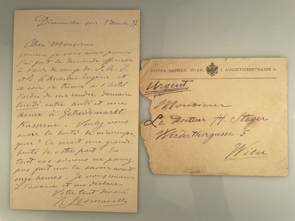 LEONCAVALLO, Ruggiero [1857-1919]: Eigenhändiger Brief mit Unterschrift in französischer Sprache auf dem Briefbogen des Hotels Sacher. [Wien] 5.12.[18]97 Quart. 1 Seite. Mit dem Briefumschlag des Hotels Sacher (an der Seite aufgerissen)