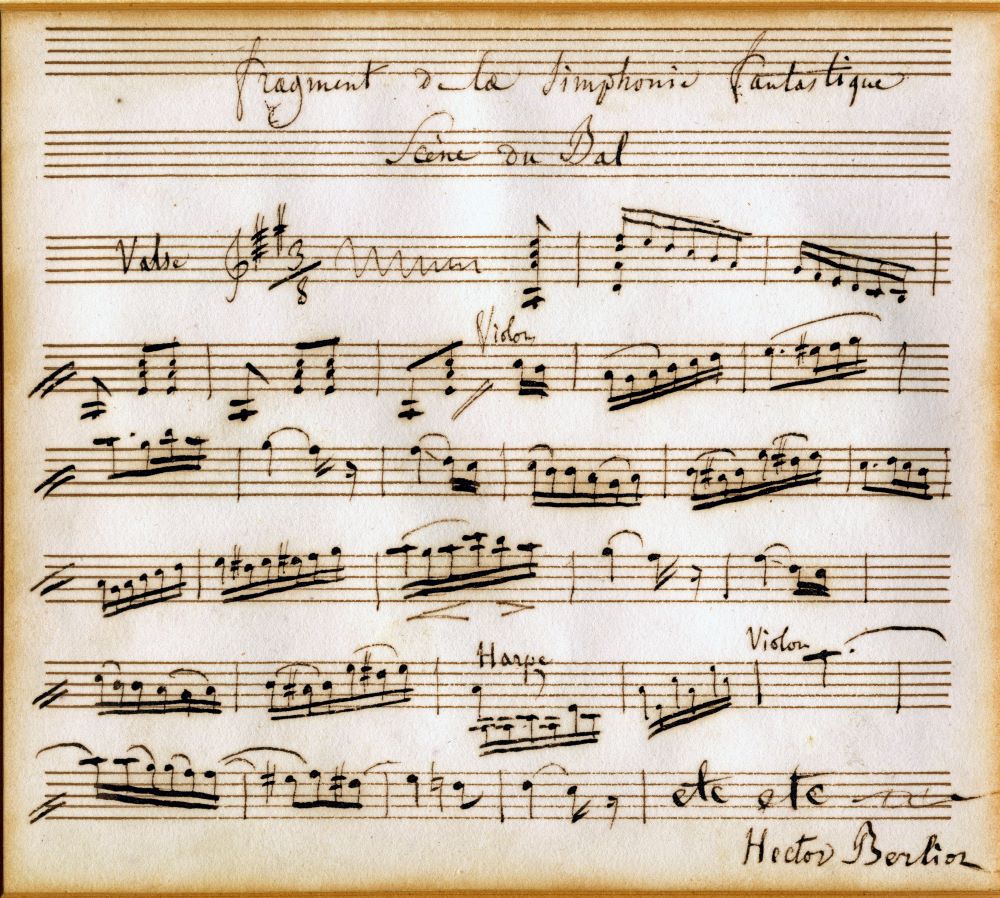 Großes, dekoratives Albumblatt, vom Komponisten überschrieben "Fragment de la Simphonie Fantastique. Scène du Bal". Die 28 Takte in 6 Zeilen sind mit "Valse" bezeichnet und stammen aus dem zweiten Akt der Symphonie. Das Werk gilt als eines der bedeutendsten und innovativsten Stücke der romantischen Musik. Die Uraufführung fand im Dezember 1830 im Pariser Konservatorium statt. In den folgenden Jahren nahm Berlioz mehrfach Änderungen vor. Die Partitur erschien erst nach Berlioz' Deutschlandtournee 1842.
