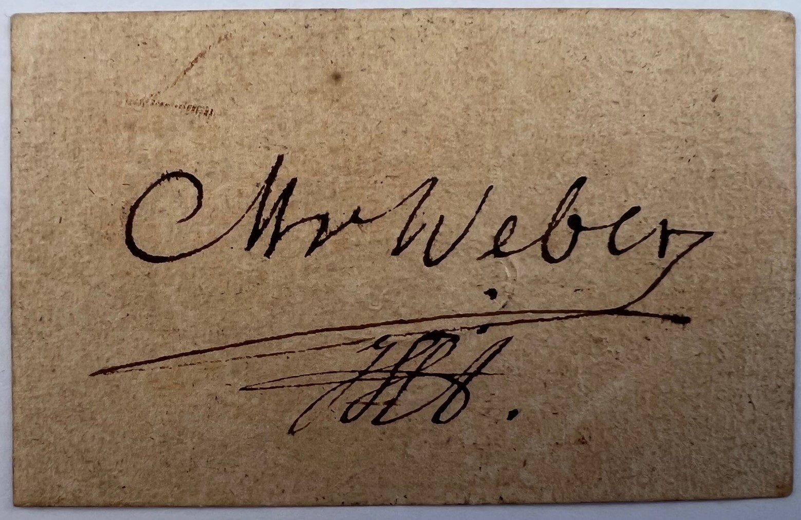 WEBER, Carl Maria von [1786-1826]: Printed entrance ticket: "Concert de Charles Marie de Weber" with Weber's autograph signature "CMv Weber" on the backside. Ohne Ort und Datum [Um 1810]. 5,3 x 8,4 cm. Lightly browned. With ornamental blind embossing in the center.