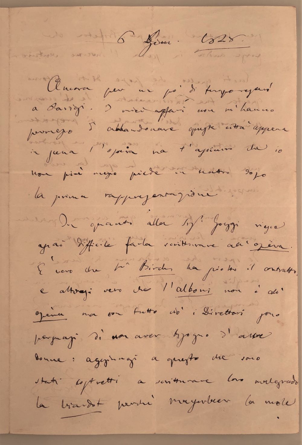 Verdi befand sich seit Herbst 1847 in Paris, hatte nach zweimonatigen Proben am 26.11.1847 die Uraufführung der umgearbeiteten "Lombarden" unter dem neuen Titel "Jerusalem" mit mäßigem Erfolg erlebt und bemühte sich gerade "den Atila in einem erbärmlichen Gesundheitszustand zu Ende zu bringen" (Brief Verdi an F.M. Piave vom 14.1.1848). Zudem arbeitete er in dieser Zeit an der Oper "Il Corsaro", die er mit wenig Lust schnell herunterschrieb, weil er sich hierzu vom Mailänder Verleger Francesco Lucca dazu gezwungen sah und sich daher so beleidigt fühlte, dass er Lucca als "Hornochsen" betitelte. Aus dieser Lebenssituation heraus ergibt sich, dass Verdi in seinem Brief anfangs und am Schluss erklärt, noch etwas in Paris bleiben zu müssen und erst nach der ersten Aufführung seiner Oper meint, nach Italien zurückkommen zu können. Die politische Entwicklung in Italien, insbesondere die Aufstände in Mailand ab 18. März 1848 haben den vom Freiheitsgedanken begeisterten Verdi aber dazu bewegt, seine Pläne zu ändern und schon Ende März nach Italien zu reisen, um den Kampf der Unabhängigkeit dort gegen die österreichische Herrschaft zu unterstützen (vgl. hierzu Verdis Brief an F.M. Piave vom 21.4.1848). Über das Pariser Musikleben berichtet Verdi in seinem unveröffentlichtem Brief u.a., dass sein Kollege Meyerbeer gerne die Mezzosopranistin Pauline Viardot-Garcia (1821-1910), die auf allen Opernbühnen Europas triumphale Erfolge feierte, für seine neue Oper "Le Prophète" engagieren würde, von der er annahm, dass diese im kommenden Winter aufgeführt werden würde, was dann aber erst am 16.4.1849 in der Pariser Oper geschah. Bezüglich seines Einsatzes für die Sopranistin Emilia Goggi (1817-1857), die 1845 als Abigaille in "Nabucco" und 1846 als Elvira in "Ernani" aufgetreten war, erklärt Verdi, dass es doch ziemlich schwierig sei, für diese, von ihm sehr geschätzte Künstlerin, ein Engagement an der Pariser Oper zu vermitteln. Auch unter seiner Annahme, dass die Opernsängerin Marietta Alboni nicht mehr an der Oper sei, bedauert Verdi es, dass die Direktoren der Oper leider davon überzeugt seien, keine anderen Frauen zu brauchen. Vollständige Transkription und Übersetzung des Briefes ist vorhanden. Nicht in Cesari/Luzio: Copialettere di G. Verdi.