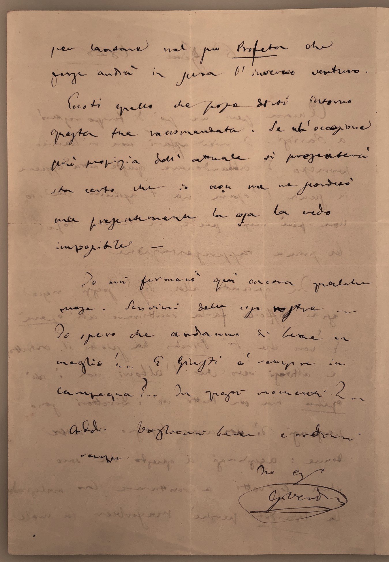 Verdi had been in Paris since the fall of 1847. After two months of rehearsals, he had seen the premiere of the reworked "Lombards" under the new title "Jerusalem" on November 26, 1847, with moderate success, and was currently trying "to bring Attila to a close in a miserable state of health" (letter Verdi to F.M. Piave, January 14, 1848). In addition, he was working at this time on the opera "Il Corsaro", which he quickly wrote down with little desire, because he felt forced to do so by the Milanese publisher Francesco Lucca and therefore felt so offended that he called Lucca a "horndog". From this life situation it follows that Verdi explains in his letter, at the beginning and at the end, that he had to stay in Paris for a while and that he thought he would be able to return to Italy only after the first performance of his opera. However, political developments in Italy, especially the uprisings in Milan starting on March 18, 1848, prompted Verdi, who was enthusiastic about the idea of freedom, to change his plans and travel to Italy as early as the end of March to support the struggle of independence there against Austrian rule (cf. Verdi's letter to F.M. Piave of April 21, 1848). Regarding the musical life in Paris, Verdi reports in his unpublished letter, among other things, that his colleague Meyerbeer would like to engage the mezzo-soprano Pauline Viardot-Garcia (1821-1910), who celebrated triumphant successes on all opera stages in Europe, for his new opera "Le Prophète", which he assumed would be performed in the coming winter, but this did not happen until 16th of April 1849 at the Paris Opera. Regarding his commitment to the soprano Emilia Goggi (1817-1857), who had appeared as Abigaille in "Nabucco" in 1845 and as Elvira in "Ernani" in 1846, Verdi explained that it was rather difficult to arrange an engagement at the Paris Opera for this artist, whom he held in high esteem. Even assuming that the opera singer Marietta Alboni was no longer at the opera, Verdi regrets that the directors of the opera were unfortunately convinced that they did not need other women. Full transcription and translation of this letter is available. - Not in Cesari/Luzio: Copialettere di G. Verdi.