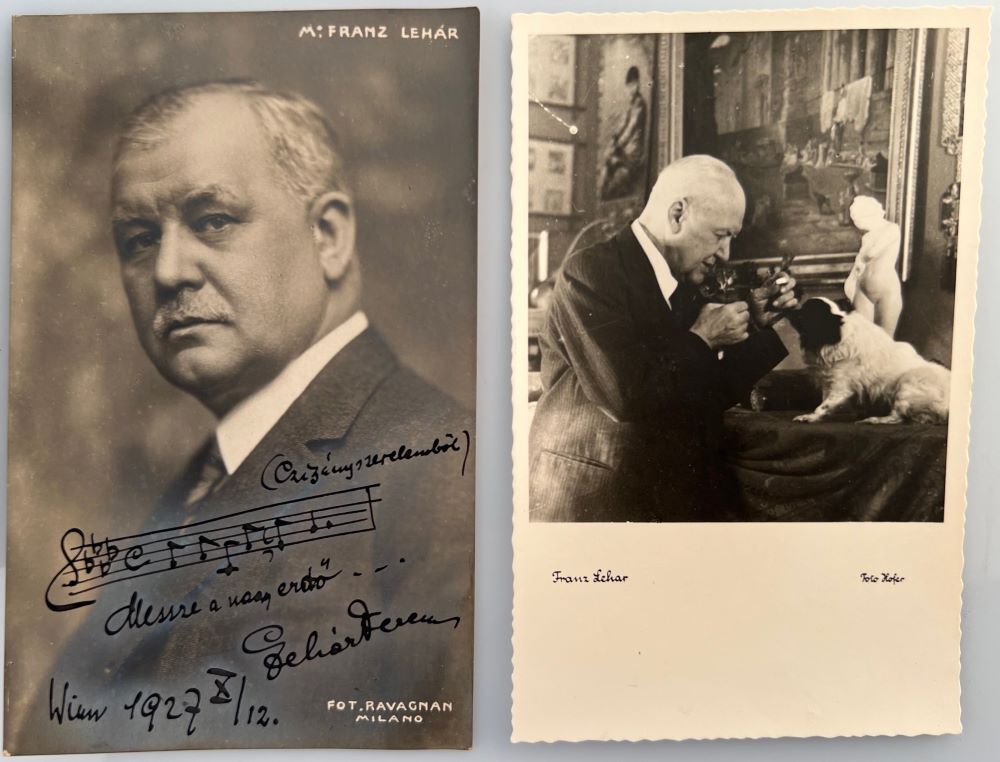 Notenzitat aus der romantischen Operette "Zigeunerliebe" mit ungarisch unterlegtem Text auf Fotografie von Ravagnan, Mailand. Beiliegend: Fotopostkarte, die Lehar mit Hund zeigt - Music quotation from the romantic operetta "Gypsy Love" with Hungarian underlaid text on photograph by Ravagnan, Milan. Enclosed: photo postcard showing Lehar with dog.