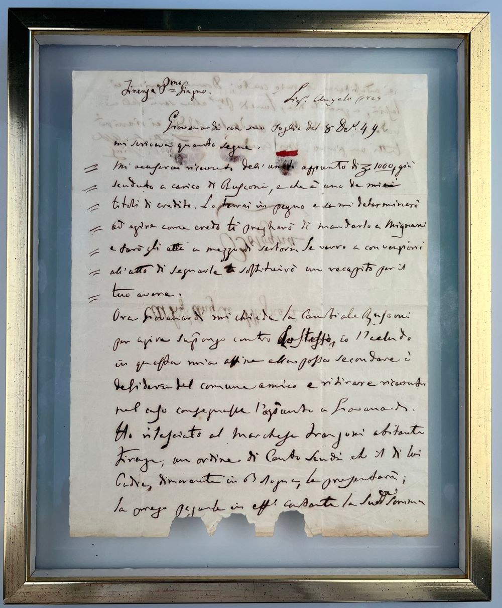 Ein interessantes Dokument an Angelo Mignani in Bologna, ein Bevollmächtigter Rossinis für Finanzen, Rechts- und Musikangelegenheiten. Rossini bombardierte gerne seine Bevollmächtigten mit Bitten um Informationen über ihre Tätigkeiten und um finanzielle Anbrechungen, mit der Forderung, seine Instruktionen und oft komplizierten Aufträge genau zu befolgen. Rossini war mit Mignani so zufrieden, dass er sogar in seinem Testament vorgesehen hat, dass ihm ein Geschenk gemacht werden solle. (Weinstock: Rossini, S.279, 281 und 420). Rossini gibt in seinem Brief Anweisungen, wie mit verschiedenen Zahlungen und Wechseln umgegangen werden soll. Ferner informiert Rossini darüber, dass Donna Maria oder Marico sein Haus verlässt und er es bedauert sie zu verlieren. Eine vollständige Transkription des Briefs und eine deutsche Übersetzung sind vorhanden.