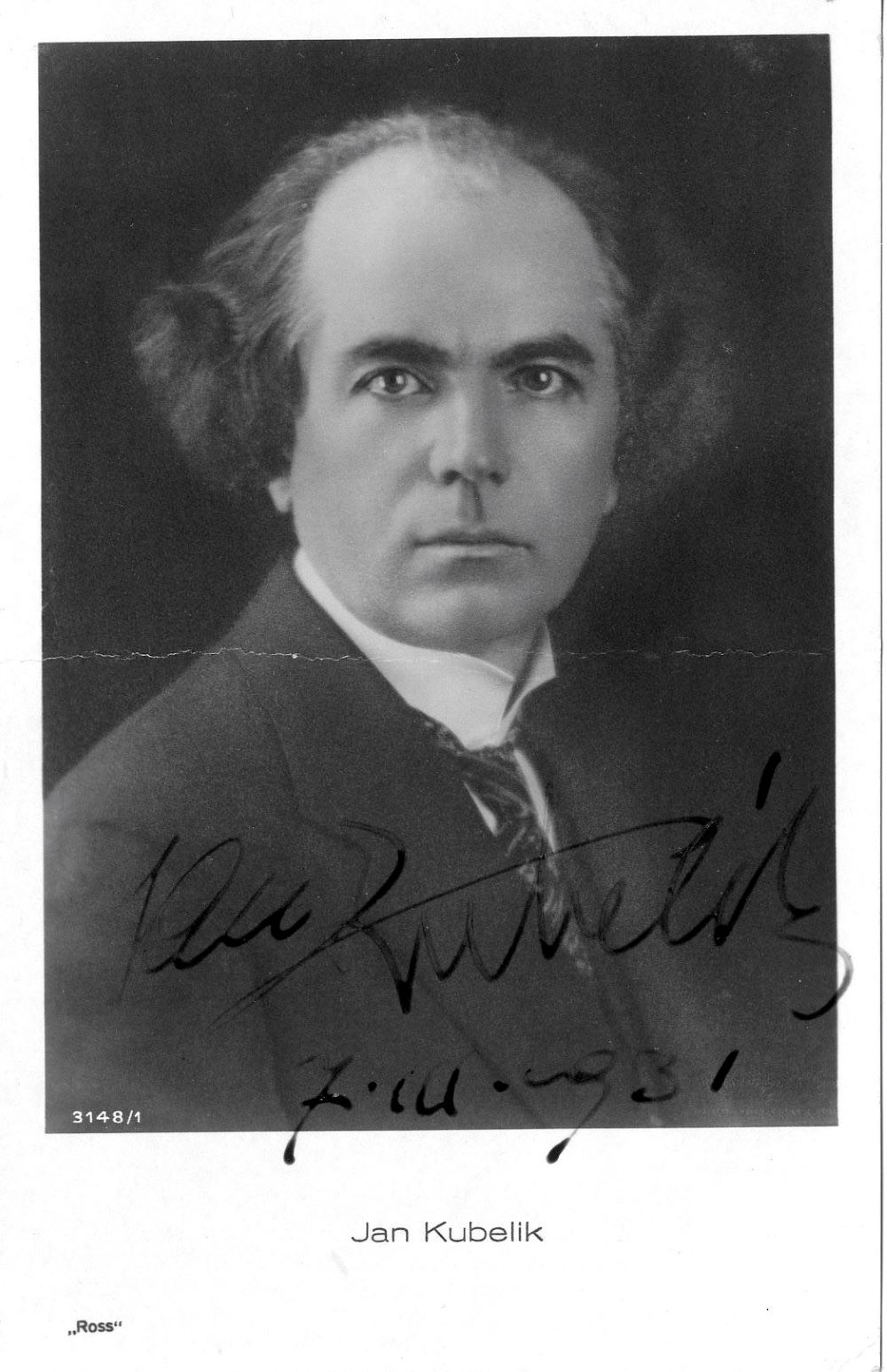 KUBELIK, Jan [1880-1940]: Porträt-Fotografie mit Datum und eigenhändiger Unterschrift. - Portrait photograph with date and autograph signature. 7. März 1931. 14x9 cm. Leicht geknickt. - Slightly creased.