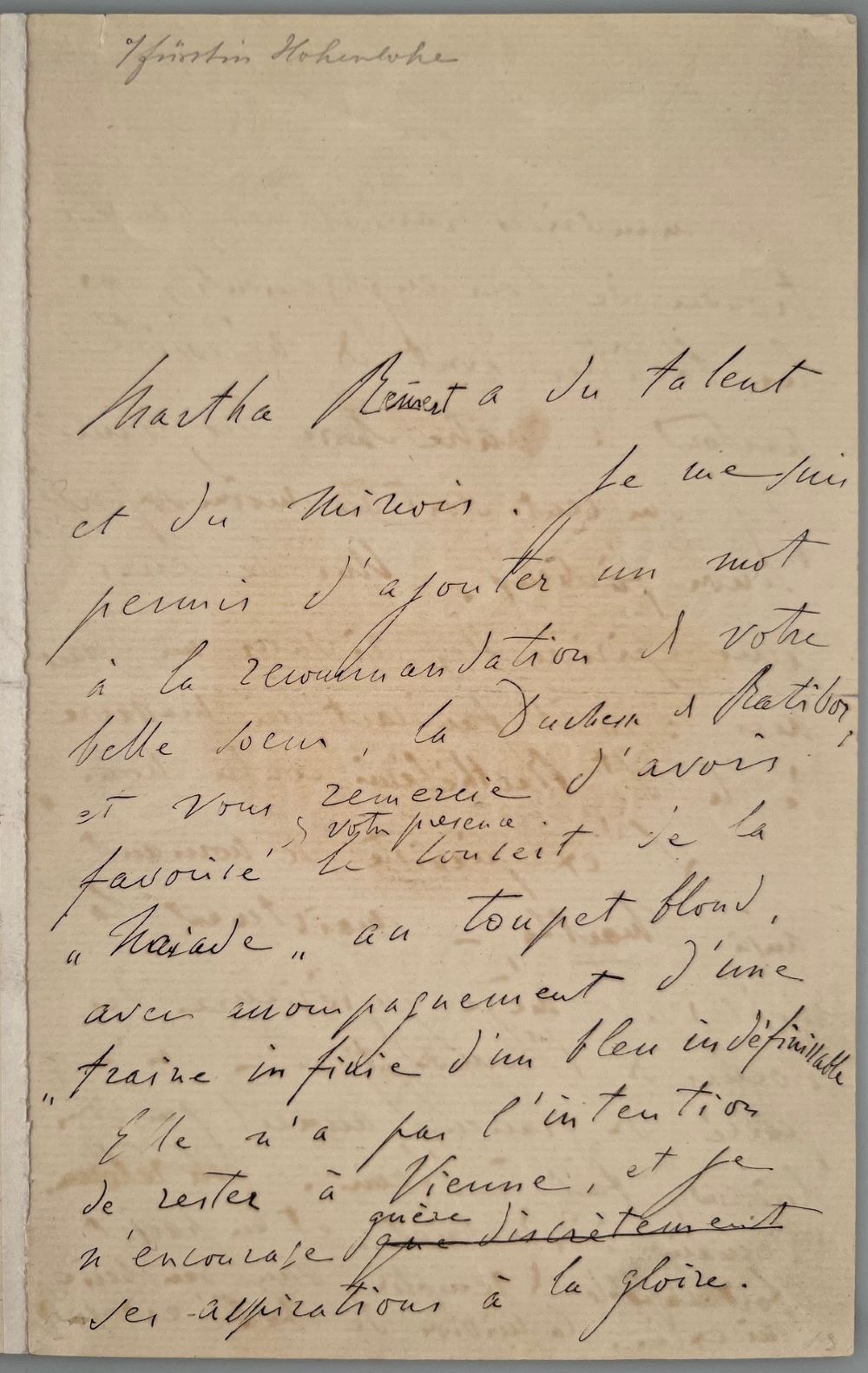 A very special letter, rich in content and unpublished, to Marie Princess of Hohenlohe-Schillingsfürst, born Princess of Sayn-Wittgenstein (1837-1920) with a recommendation for one of his talented piano students, a humorous consideration of bad singers and the evil of far too many and needless pianists.