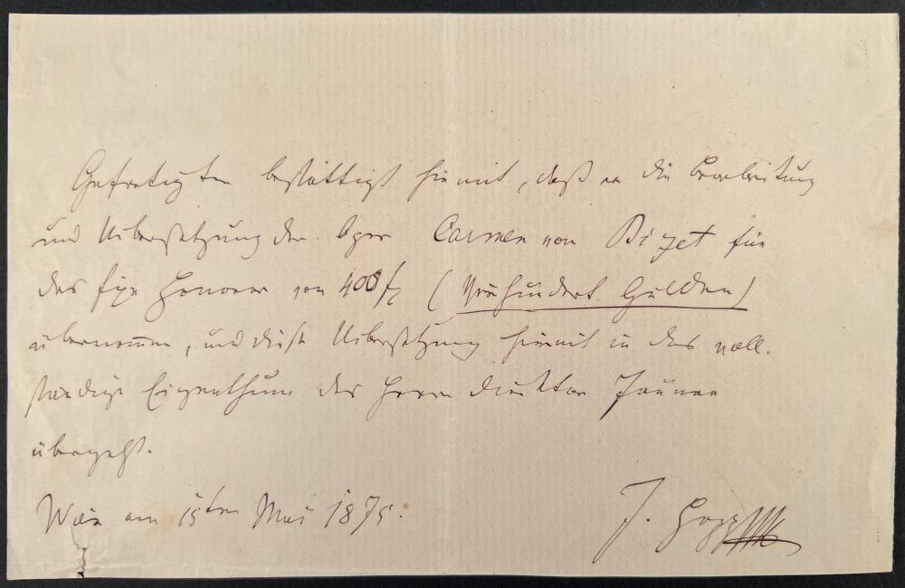 HOPP, Julius BIZET. - [1819-1885 Librettist und Übersetzer der Carmen]: Eigenhändige Abtretungserklärung der Rechte für die Bearbeitung und Übersetzung ins Deutsche des Librettos der Oper Carmen mit Ort, Datum und Unterschrift. Autograph declaration of assignment of the rights for the adaptation and translation into German of the libretto of the opera Carmen with place, date and signature. Wien 15. Mai 1875 Octavo oblong 14 x 22 cm. 1 page with small tear at lower margin.