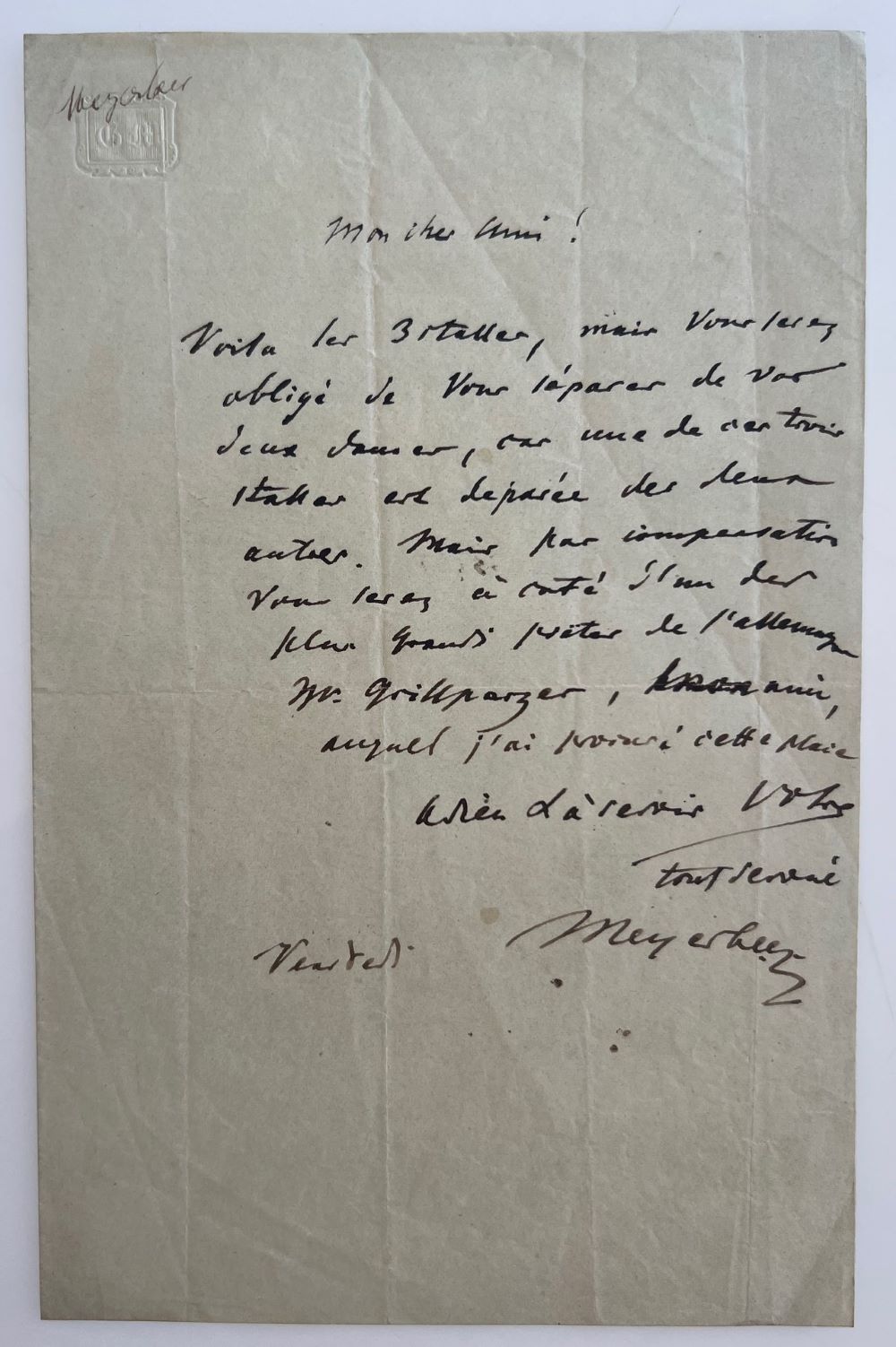Begleitschreiben an einen Freund, dem er 3 "stalles" (Platzkarten) schickt. Da nur zwei der drei Plätze beieinander seien, müsse der Freund sich leider von den beiden Damen in seiner Gesellschaft trennen. Er habe dafür das Vergnügen, den Abend neben dem deutschen Schriftsteller Franz Grillparzer zu verbringen. - Grillparzer hielt sich im Frühjahr 1836 für drei Monate in Paris auf und machte dort u.a. die Bekanntschaft mit Meyerbeer.
