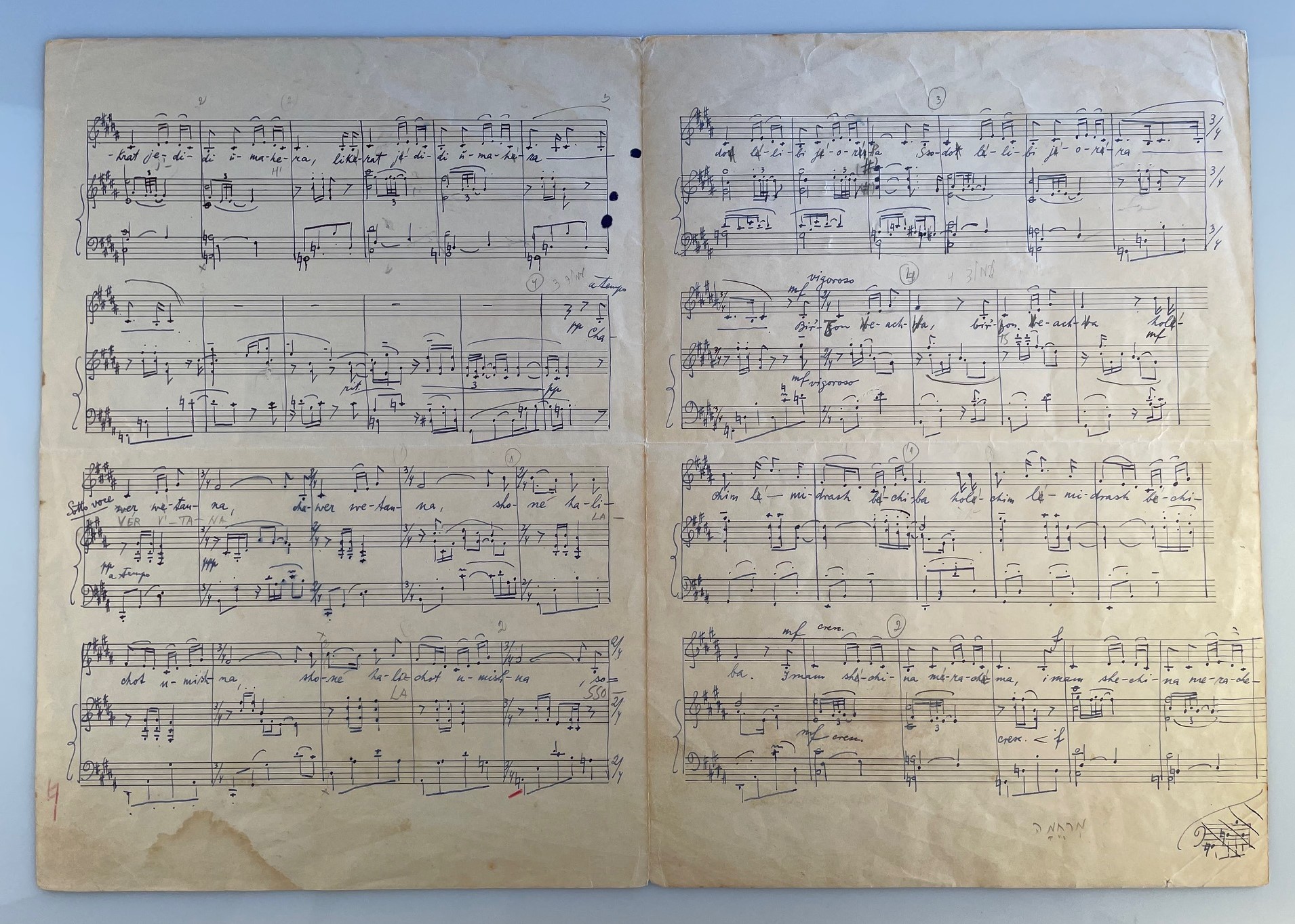 BROD, Max [1884-1968]: Autographmusic manuscript "Sar hamemune" (After a melody from Yemen-Teman) Op. 31a with name in title. No place and date [before 1947] Folio 35 x 25 cm. 3,5 pages on double leaf with 12 staves. Somewhat dusted, crease, small water stain at lower margin. Signs of use.