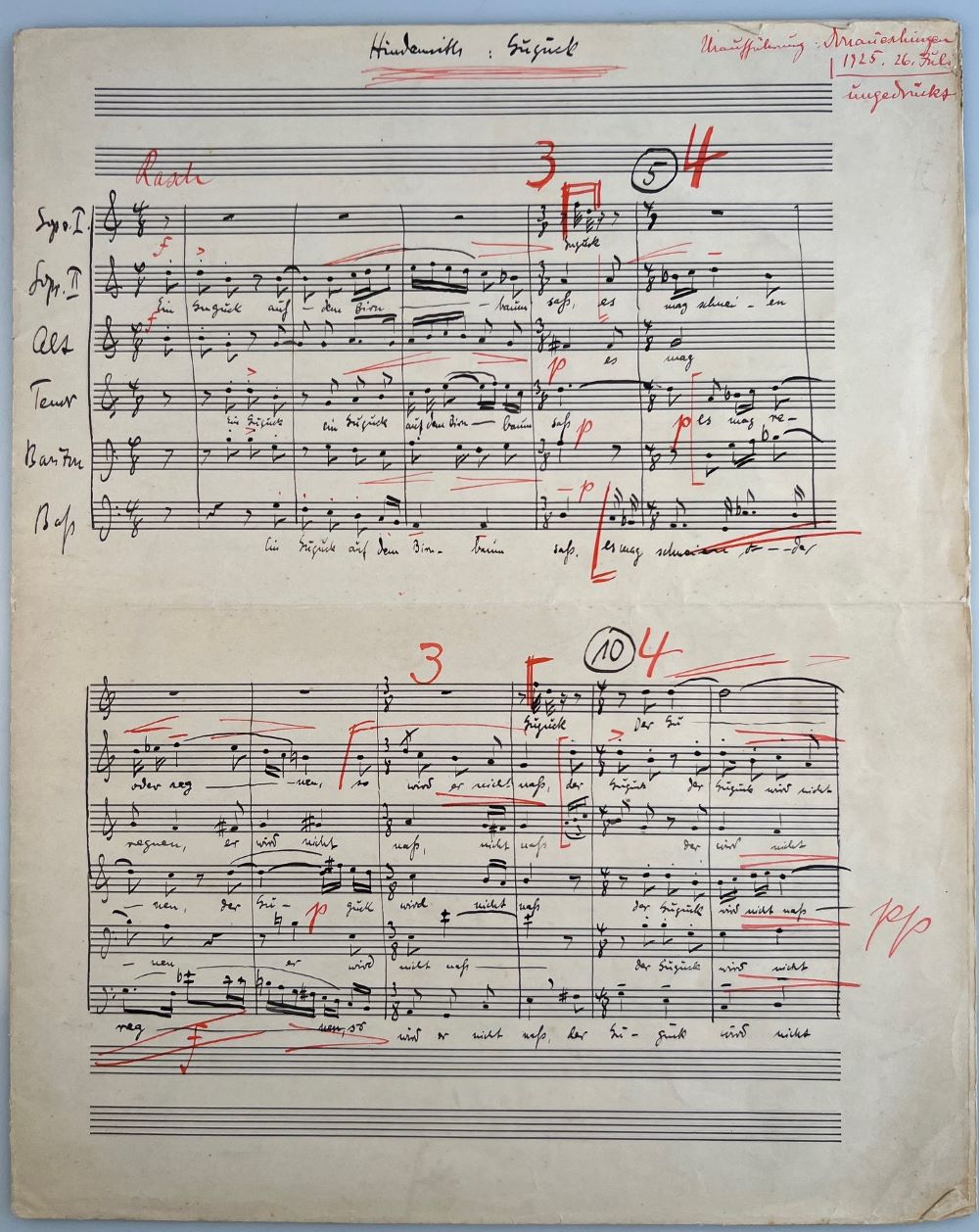 The a cappella composition "Guguck" was premiered in Donaueschingen on 6/26/1925 by Hugo Holle, the leader of the Stuttgart Madrigal Association. The present copy, made by Hugo Holle, represents his working copy for the premiere, since it is marked with his additional interpretative entries in red and on the upper right corner of the first page of the manuscript is also noted by him in red: "Premiere: Donaueschingen 1925. July 26. unprinted". The "Guguck" is the 7th song from the collection "Lieder nach alten Texten," op. 33, composed by Hindemith in 1923.