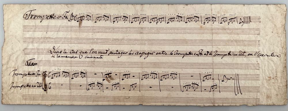 Ten bars for "Trompette en Fa". Below a second version of the small composition, for Fa and Do/Ut trumpet in alternation notated with the comment by Meyerbeer: "Dans le cas que l'on veut partager entre la Trompete en Fa et la Trompete en Ut, on l'exécutera de la manière suivante".