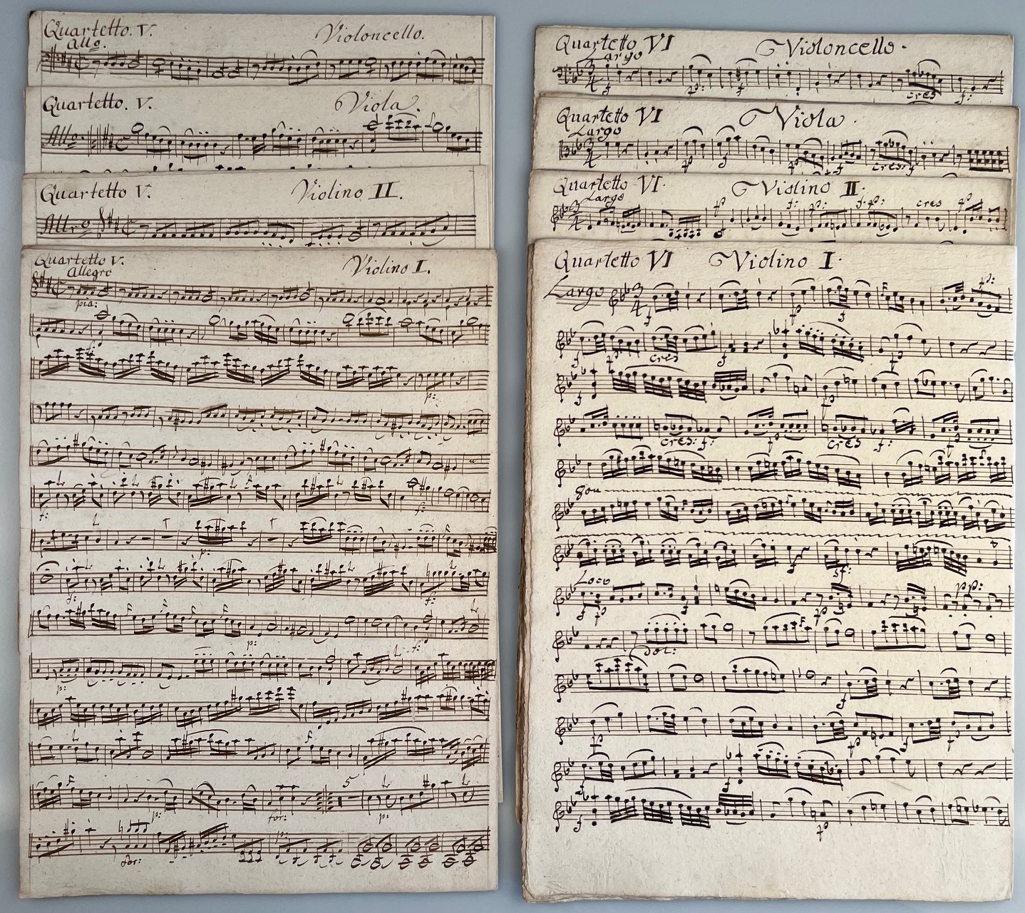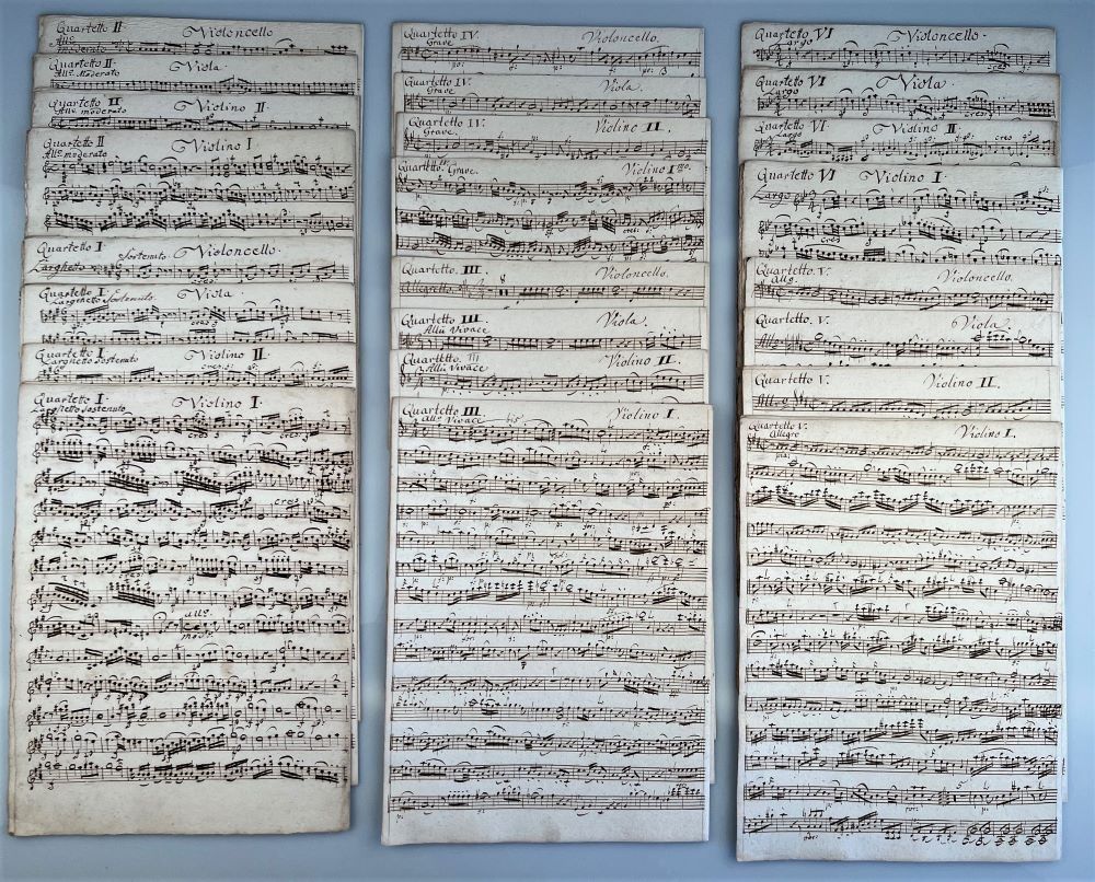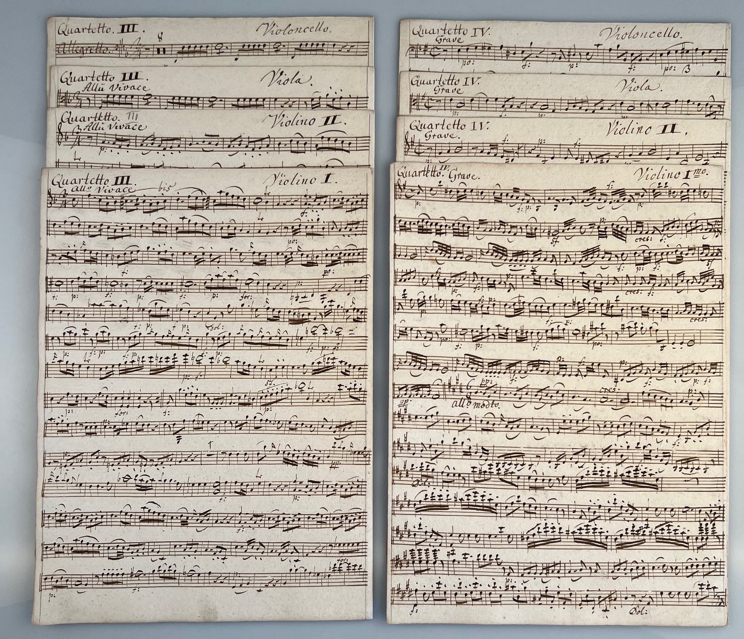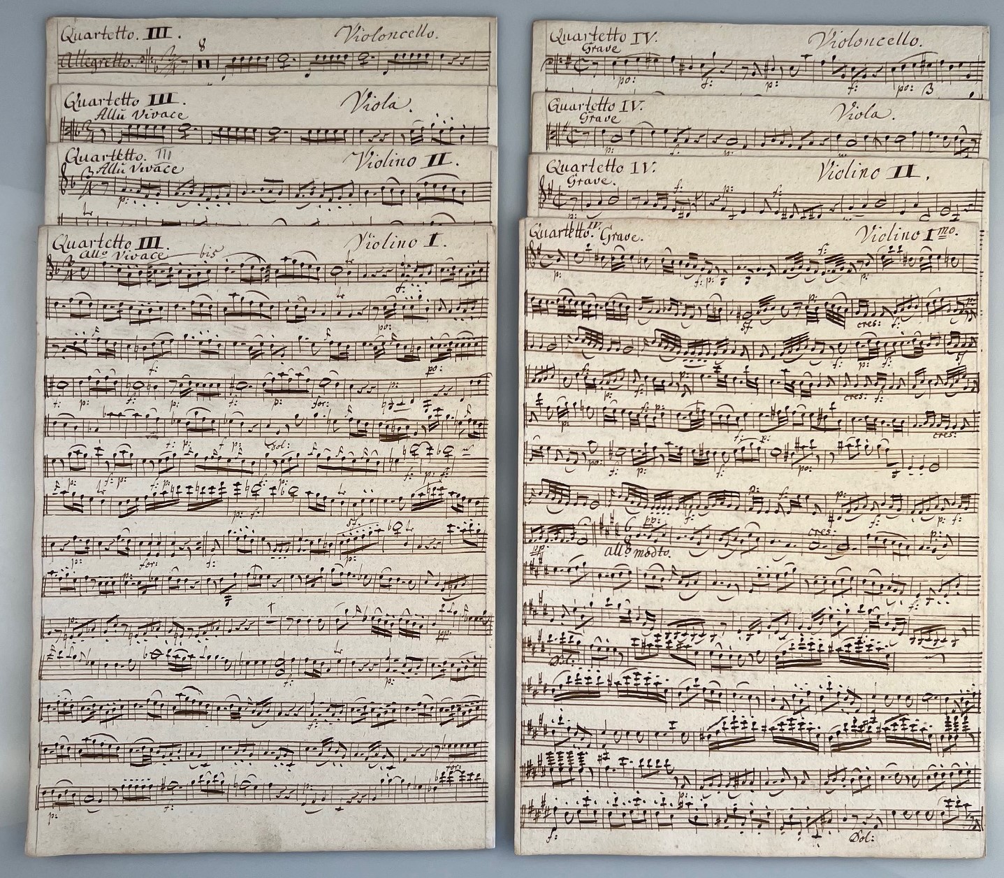 PICHL, Václav [Wenzel] [1741-1805]: Musikmanuskript der 6 Streichquartette in A-Dur, C-Dur, F-Dur, e-Moll, D-Dur und b-moll, Op. 2. Stimmen. - Music manuscript of the 6 string quartets in A major, C major, F major, E minor, D major and B flat minor, Op. 2. Parts. Ohne Ort und Datum [vermutlich Wien, 2. Hälfte des 18. Jahrhunderts] Folio 31 x 23cm. Kompletter Stimmensatz von mindestens zwei, vermutlich Wiener Schreibern, mit brauner Tinte auf bis zu 14 Systemen pro Seite geschrieben. Circa 100 Seiten plus Leerseiten - Complete set of parts written by at least two, probably Viennese scribes, in brown ink on up to 14 systems per page. Approximately 100 pages plus blank pages.