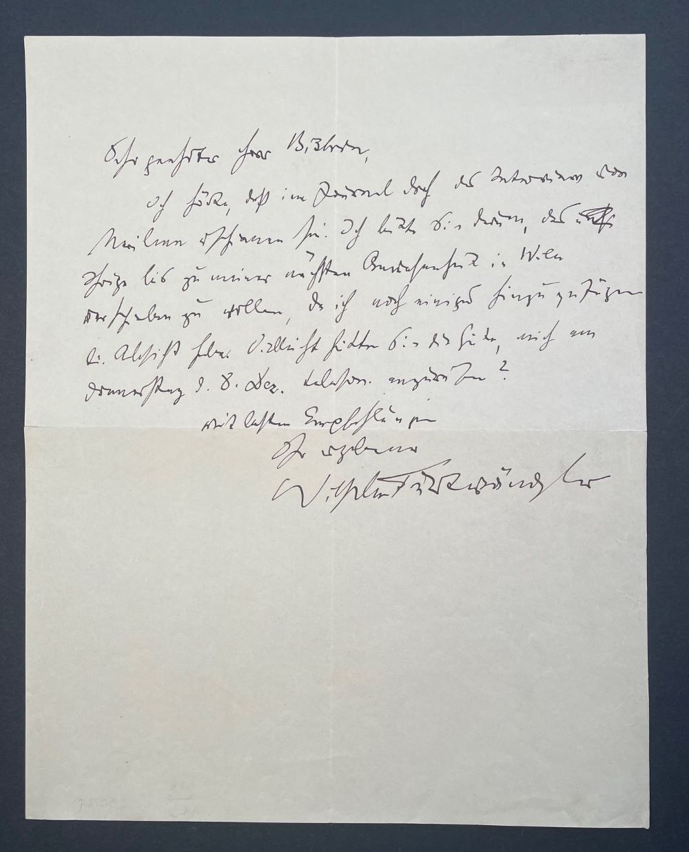 An einen Journalisten, den er bittet, den Termin für das Erscheinen eines Interviews zu verschieben: "ich hörte, dass im Journal das Interview von ... erschienen sei. Ich bitte Sie darum das Ihrige bis zu meiner nächsten Anwesenheit in Wien verschieben zu wollen, da ich noch einiges hinzu zufügen die Absciht habe. Vielleicht hätten Sie die Güte, mich am Donnerstag d. 8. Dez. tefefon. anzurufen?" - To a journalist whom he asks to postpone the date of appearance of an interview: "I heard that in the Journal the interview of ... has appeared. I would like to ask you to postpone yours until the next time I am in Vienna, since I still have some things to add. Perhaps you would have the goodness to call me on Thursday, December 8?