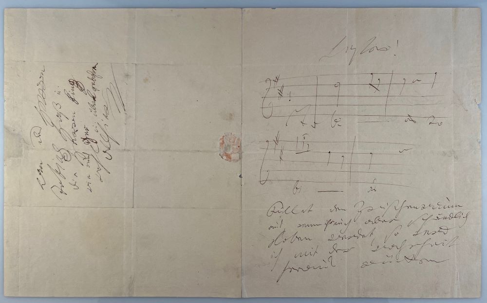 FROM THE GRANDMASTER OF THE CRESCENDO - A QUITE EXTRAORDINARY LETTER FOR THREE REASONS: 1. Beethoven's struggle and problems with the realization of his extended crescendo idea 2. a special note joke 3. his joke in addressing and humor of the entire letter wording. Beethoven's letter to his publisher Tobias Haslinger already begins humorously with a joking addressing: "To the Lord / Tobias Haß and / the Lord Lin / as well as Ger / well and badly born / all here". The salutation "Bester!" is followed by 4 measures with a prelude to Haslinger's first name "Tobias Tobias". The actual letter is written in the "Generalissimus" tone that Beethoven used to jokingly apply to his Viennese publisher as a subordinate and, according to Georg Kinsky (Katalog der Musikautographen-Sammlung Louis Koch), refers to the corrections to the "Namensfeier" Overture op 115. "Fill in the space / in between, but if you will shamefully / praise yourselves, then / I will come out with the truth / following the corrections / I ask you, after / the mistakes have been corrected / to send them to me still tomorrow / I ask you all the time after cres = = / = not to forget this kind of little strokes / Be well / Euer etc etc etc / Beethoven". For Beethoven, as the master of the crescendo, the realization of his dynamic instructions was a significant issue. Therefore, he communicated his intentions extremely precisely through dynamic signs. It is "Beethoven's peculiarity to designate the range of the cresc. by indicated - - - or = = = ... the cresc = = = always extend to the next dynamic designation." (see Mies, Paul: Textkritische Untersuchungen bei Beethoven, Bonn 1957, p. 101 and p.105f.) Often, however, these dynamic signs were not understood by the engravers of the music publishers and were therefore simply omitted. The present example shows very well how consistently Beethoven made sure that his special designation for the length of the crescendo was actually implemented in the printing of his works. One can vividly imagine that Beethoven was once again annoyed by the omissions of his exact dynamic designations, but was nevertheless in such a good mood when writing this letter to his publisher that he humorously added a musical music joke to his complaint and commented on it amusingly in the Generalissimus tone. The note joke is to be understood as Beethoven's musically admonishing forefinger to his publisher, reprimanding him by calling out his first name twice. After the development of the crescendo in the Mannheim School, Beethoven set the most significant milestones in its further development, among other things by significantly extending the lengths of the crescendo over many bars. "Beethoven always went to the limits and even beyond, as a human being probably, but also and above all musically. He invented, for example, the piano subito, that is, a crescendo that is carried on and on to the extreme, and which then abruptly breaks off with a sudden piano. To compose something like that, even to play it, takes incredible courage. Normally, just before the climax of the crescendo, the musicians swerve, become quieter, and create a smooth transition. But that's against the nature of this music. You have to have the courage to take the crescendo to the end and then let it end abruptly." (Daniel Barenboim in conversation with Julia Spinola reprinted in the Musikverein's magazine: Internet: musikverein.at/magazin/2020/ november/alles-was-das-leben-ausmacht)