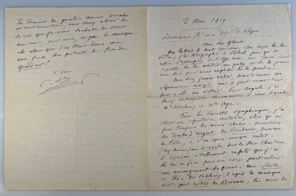 SAINT SAENS, Camille [1835-1921]: Autograph letter with place, date and signature. Eigenhändiger mit Ort, Datum und Unterschrift. Hamamm R'ichza Dept d Alger 2. Mai 1919 Quarto 27 x 21cm. 3,5 pages.