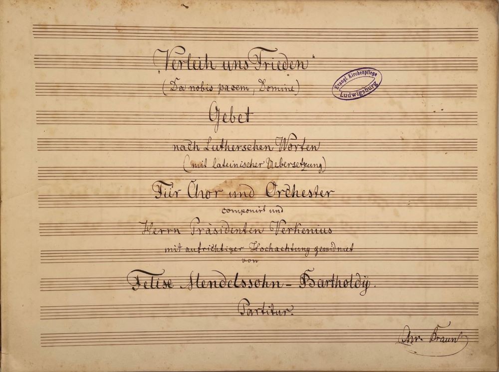 MENDELSSOHN BARTHOLDY, F.: "Verleih uns Frieden" (Da nobis pacen, Domine) Gebet nach Lutherschen Worten (mit lateinischer Uebersetzung) Für Chor und Orchester componiert und Herrn Präsidenten Verkenius mit aufrichtiger Hochachtung gewidmet ... Partitur. (Handschrift von) Chr. Braun [WoO 5] [MWV A 11]. 26. August 1851 Quer-Quart. Titelblatt (Stempel), 10 unn., lin. Seiten, 5 lin. Leerseiten. Pappband der Zeit mit Buntpapier und Titelschildchen. Gestempelt.