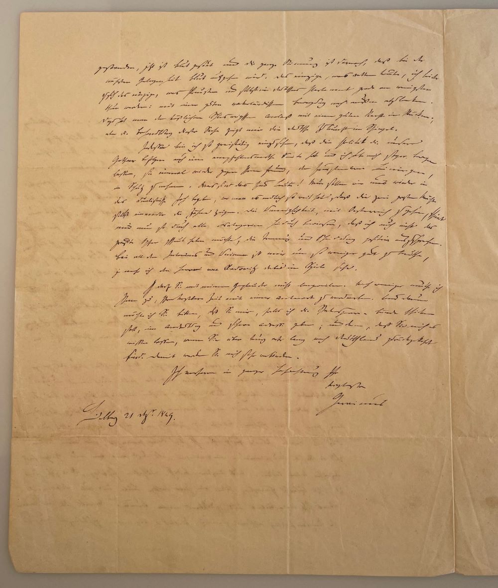 Gervinus bedauert, Stockmar bei seinem Aufenthalt in Frankfurt versäumt zu haben, "da ich Sie so gern einmal wieder über unsere Dinge gehört hätte. Nebenbei hätte ich Ihnen gerne ein Exemplar der 3 hier jetzt erschienenen Bändchen meines Shakespeare überbracht, eine Arbeit bei der ich Erholung fand, und mit deren Abschluss ich beschäftigt bin". Es folgte ein abschließender 4. Band. Falls Stockmar "für eine Lecture der Art Zeit und Lust habe", so wolle er ihm die Bände gerne zusenden. Zur politischen Situation kommentiert Gervinus: "Unseren deutschen Dingen traue ich nichts zu. Wir müssen durch das ganze Fegefeuer hindurch, ohne wird der faule Leichnam unseres Mittelstandes nicht lebendig und unsere Fürsten nicht eher klug, als bis sie nicht mehr Fürsten sind. Diese Überzeugung haftet in mir, gegen meine frühen Wünsche und Hoffnungen ... Ich hätte daher gewünscht, wir wären lieber gleich in dieses Purgatorium eingegangen, als dass wir eine neue Gelegenheit dazwischen treten lassen". Aus der gegebenen Situation "hätten ein paar tüchtige Leute etwas sehr imposantes und fruchtbares machen können". Doch jetzt "ist Blut gesäät" und bei der nächsten Gelegenheit werde wohl auch Blut fließen. Das Parlament müsse eigentlich "mit einer guten vaterländischen Bewegung" nach außen ablenken. "Aber die Behandlung dieser Sache zeigt mir die elendste Zukunft im Spiegel". Weiter beklagt er das Joch in das man sich wieder begeben soll, da doch endlich "die zwei großen Mächte einander die Zähne zeigen. Die Unmöglichkeit, die Österreich zu gehen, scheint mir nun so durch alle Kategorien hindurch bewiesen, dass ich auch nicht das größte Opfer gescheut haben möchte, die Trennung und Scheidung positiv auszusprechen". Abschließend bittet er um Nachricht, wenn Stockmar wieder in Deutschland sei.